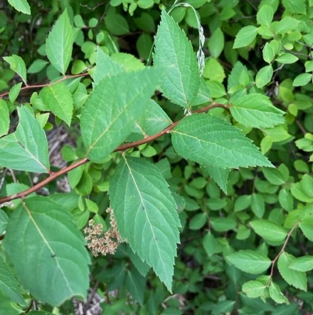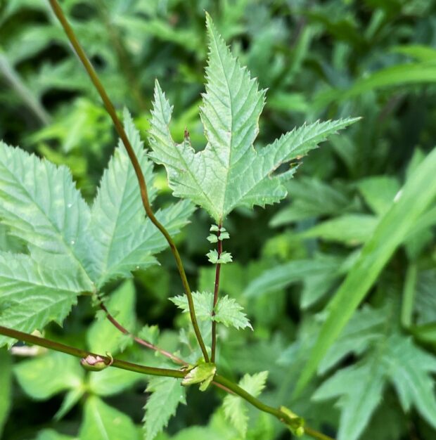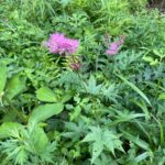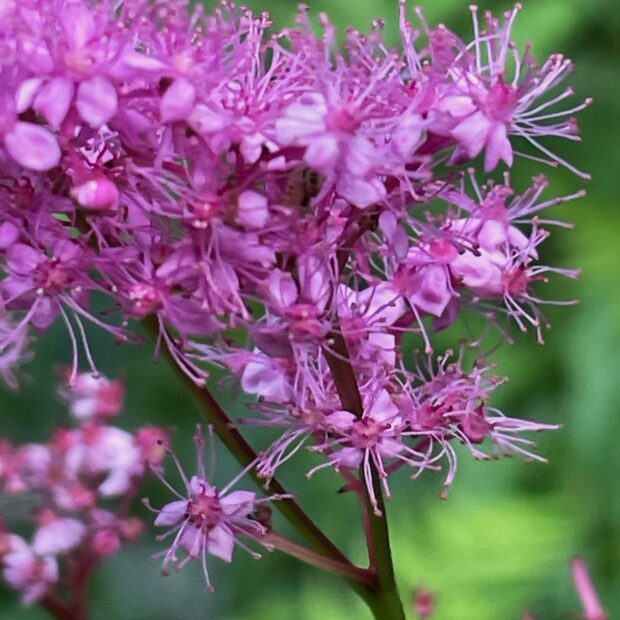 草原の散策途中、 赤紫色の花の集団がひときわ目立ちます。 シモツケ(樹木)の花と似ています。 違いは葉の形で見分けましょう。