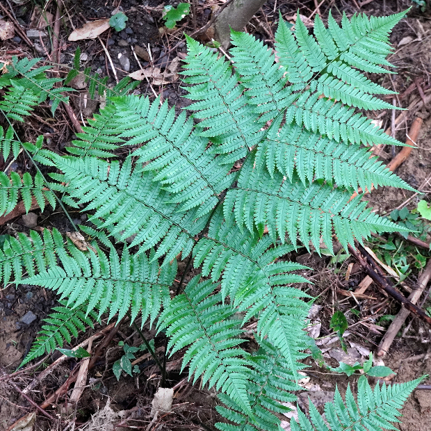 スギ林下によく群生する、 鬼のような風格のシダ。 近縁のヒカゲワラビよりも葉はさらに大きく、 くすんだ緑色をしていて、 カサカサした草っぽい質感があります。 葉裏につく胞子のう群は細く、 脈寄りにつきます。 葉柄は太く、 黒っぽく細い鱗片をまばらにつけます。