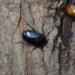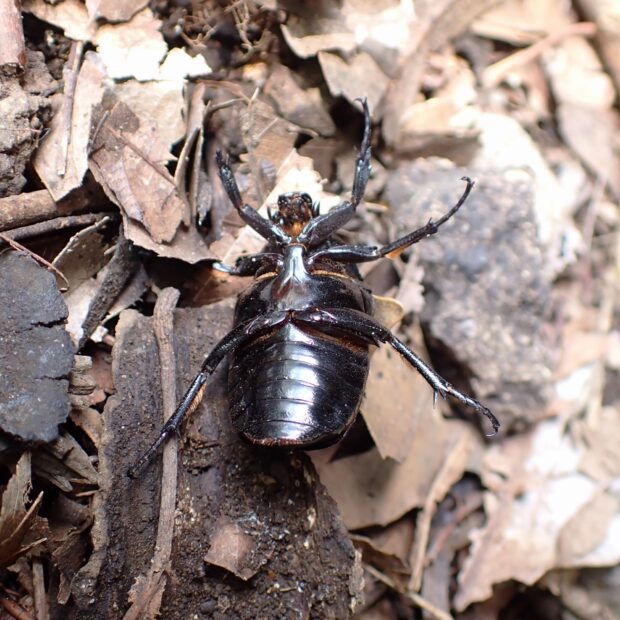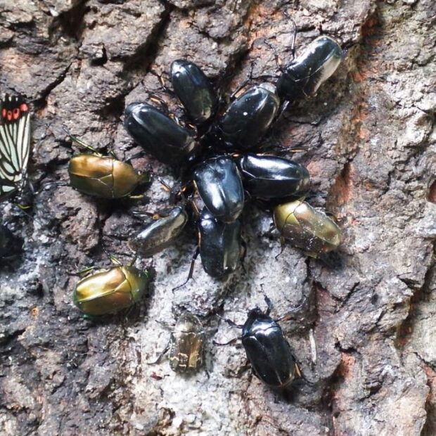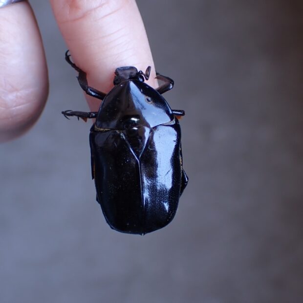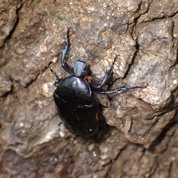 全身真っ黒で、 光沢があるコガネムシ科の甲虫。 カナブンの仲間では最も遅く現れ、 日中、 クヌギなどの樹液に集まります。 カナブンの仲間は、 上翅(じょうし)を広げずに、 後ばねだけを出して飛ぶことができます。