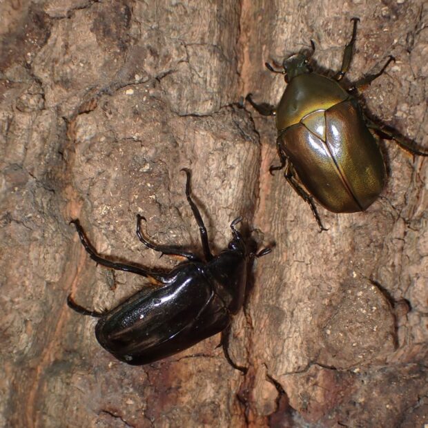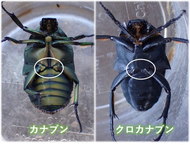 カナブンは後あしのつけねが離れていますが、 クロカナブンは接しています。