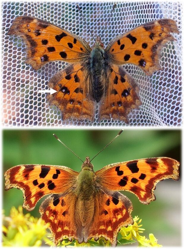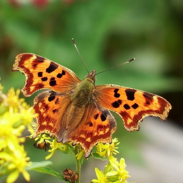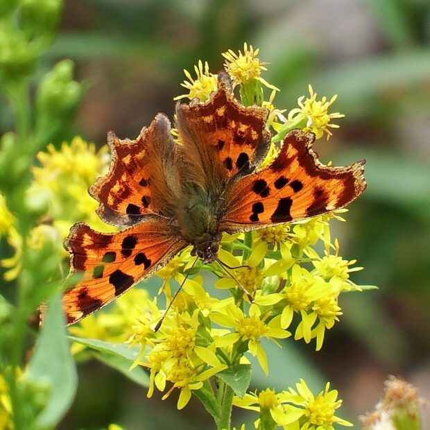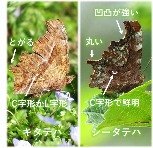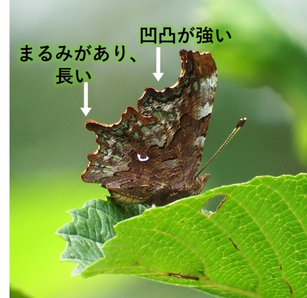 はねの裏に白い「C」字型の模様があるタテハチョウの仲間。 本州以南では山で見られます(北海道では平地でも見られる)。 いろいろな花に集まり、 オスは地面でよく給水します。