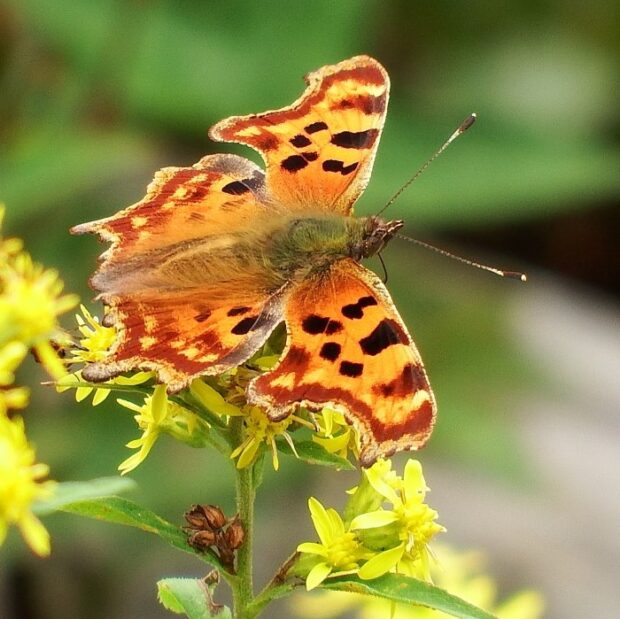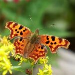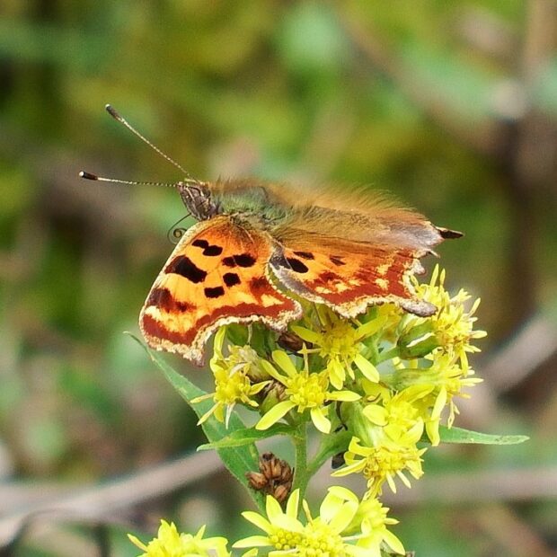キタテハは、 平地~低山地のカナムグラが生える草地で見られます。 北海道では少ないです。