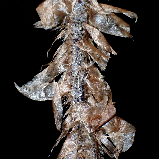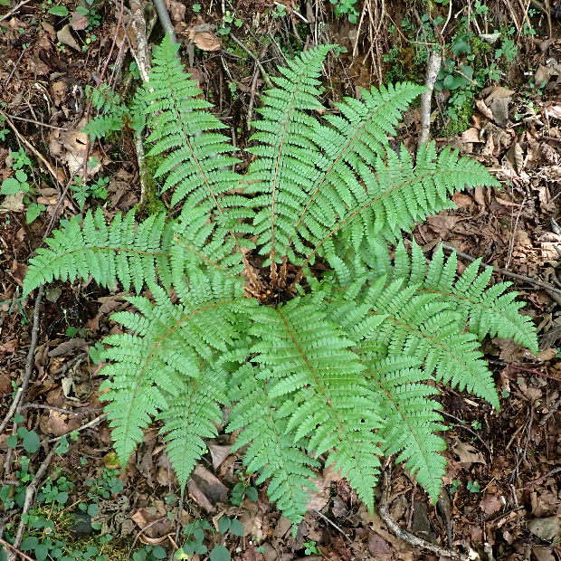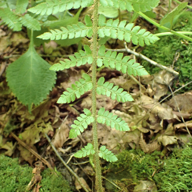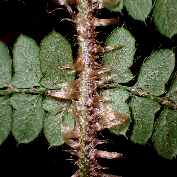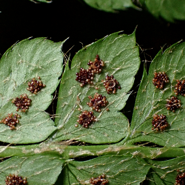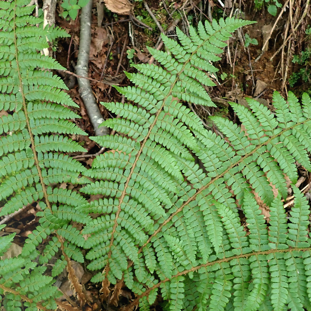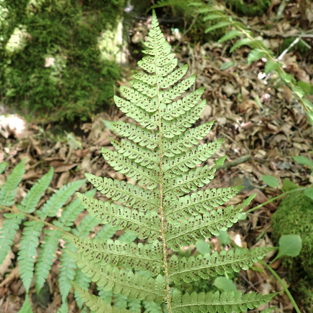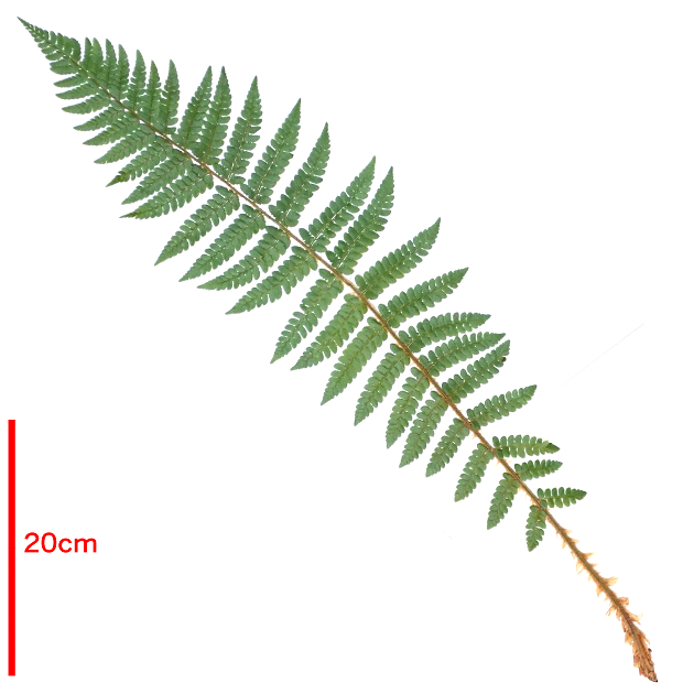 涼しい山地に生えるイノデの仲間のシダ。 葉は下ほど細長くなる形をしていて、 胞子のう群を脈に接するようにつけます。