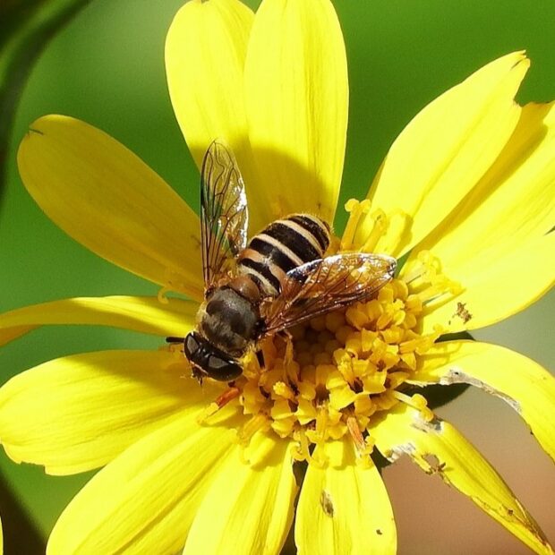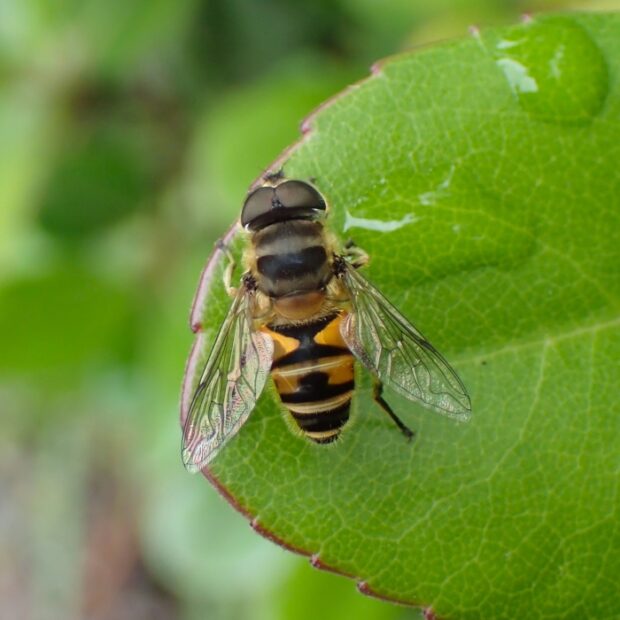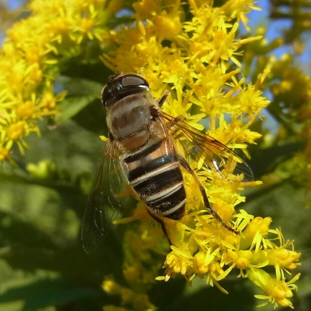 花によくやって来るハナアブの仲間。 胸に黒い横帯があるのが特徴。 ハナアブの仲間の幼虫は長い呼吸菅を持つことから「オナガウジ」と呼ばれ、 汚れた水の中で育ちます。