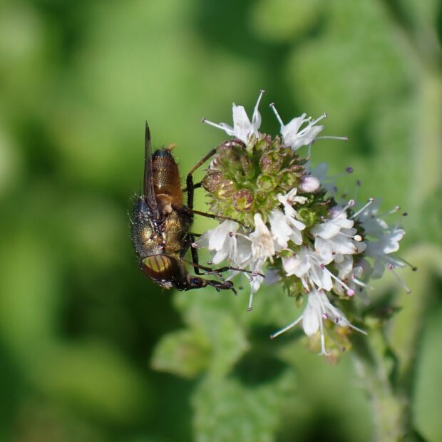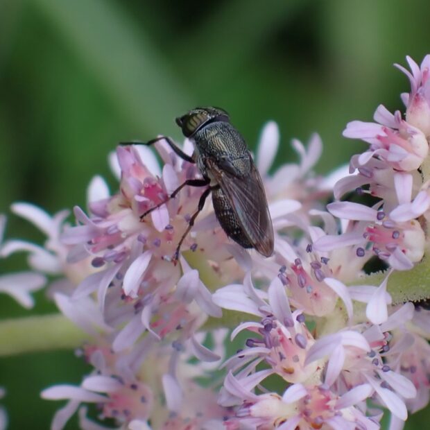 真冬の暖かい日、 菜の花は小さな虫たちで賑わう。 左はキゴシハナアブ、 右はツマグロキンバエ。