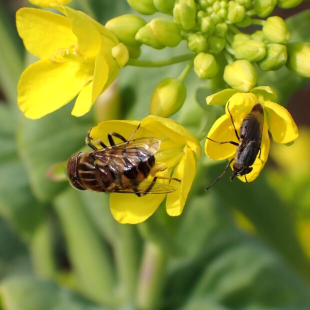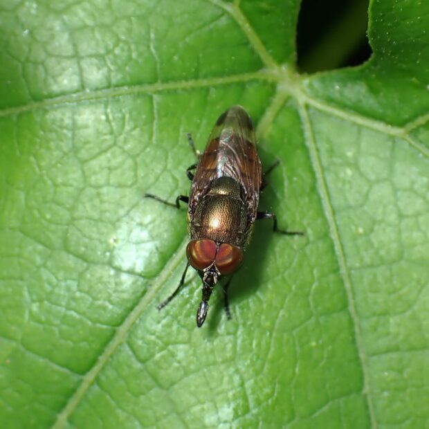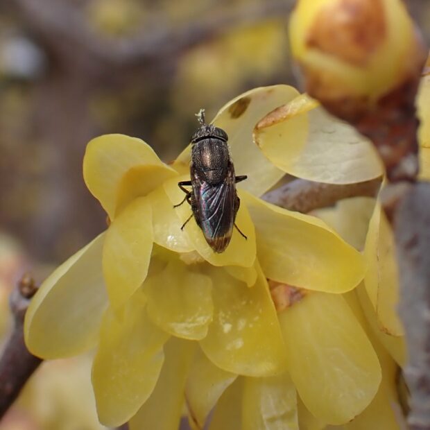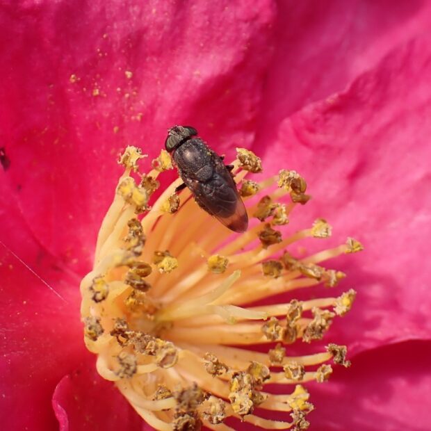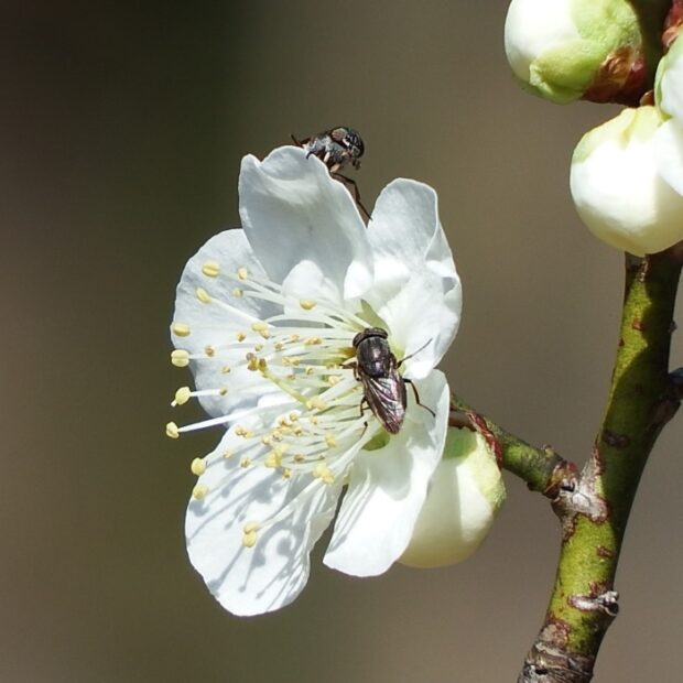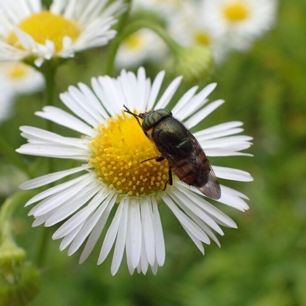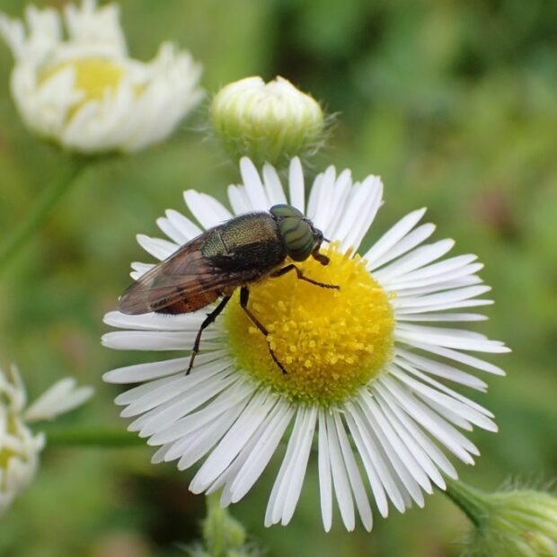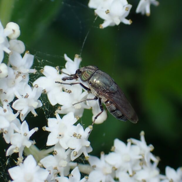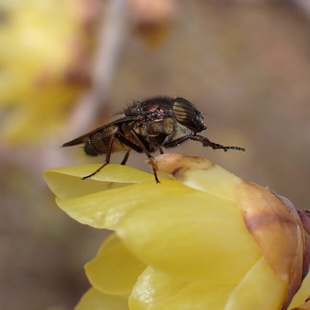 花によくやって来るクロバエ科の仲間。 冬でも暖かい日には姿を見せ、 ほぼ1年中、 普通に見られます。 胸は深緑色で毛が密生し、 はねの先端は黒くなっています。 口は折りたたみ式で長く伸ばすことができます。