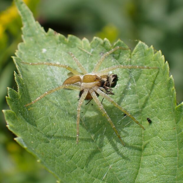スジブトハシリグモにつかまる。