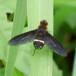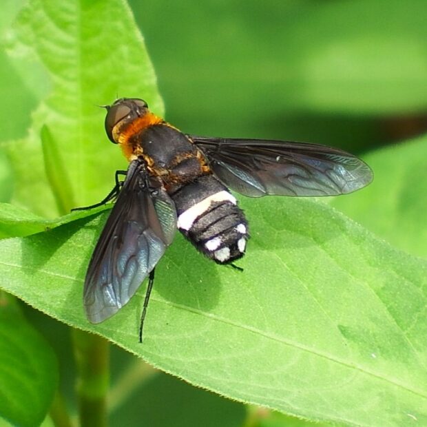 はねが黒く、 腹部に白い帯があるツリアブの仲間。 夏から秋にかけて見られ、 ツチバチ類に寄生します。 不明種を含む類似種が複数いるとのこと、 識別には注意が必要。