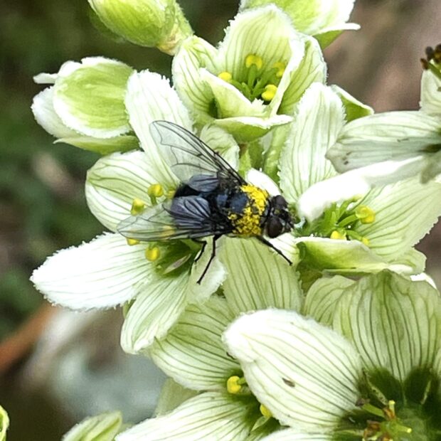 • ハエの体、 吸蜜に夢中で花粉まみれ。