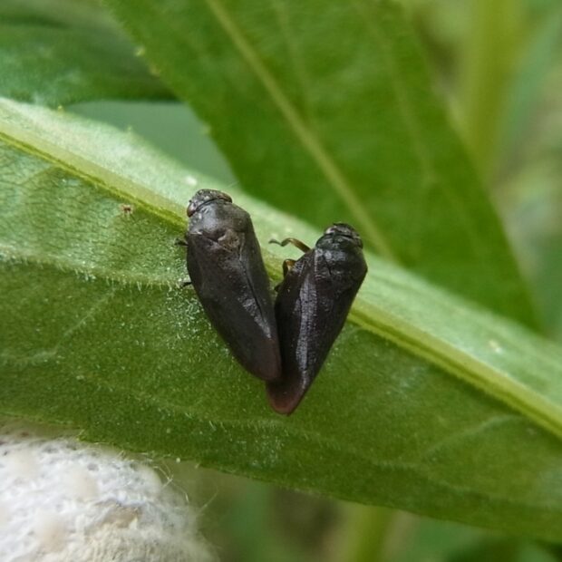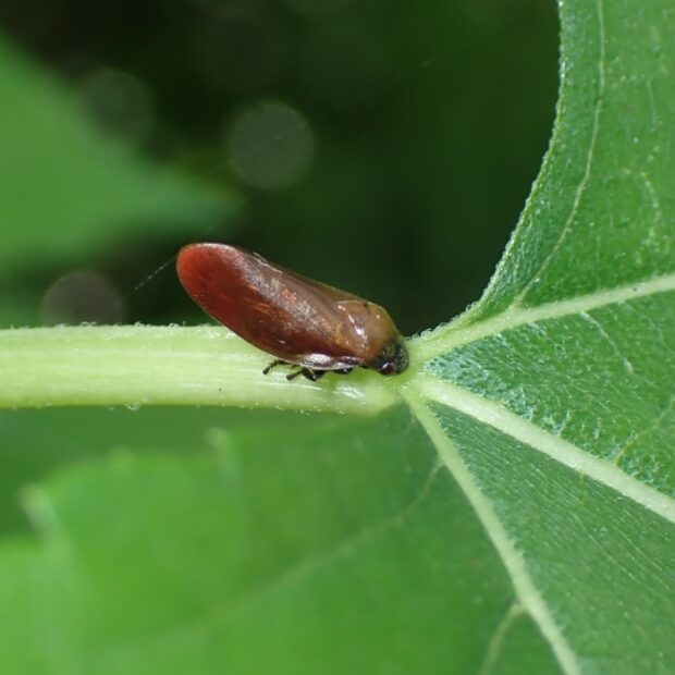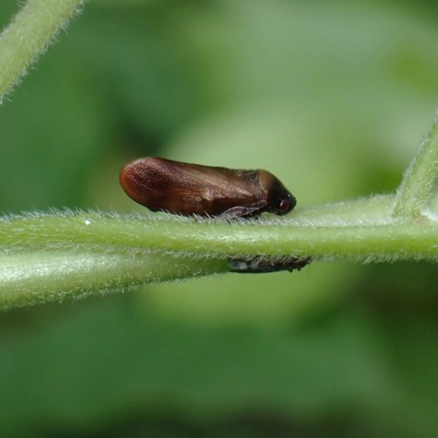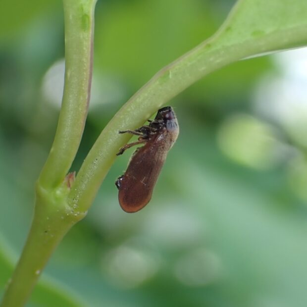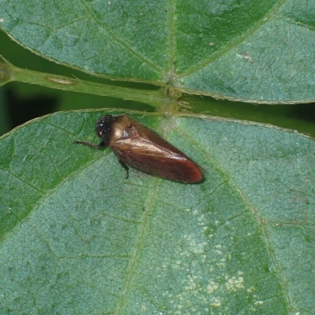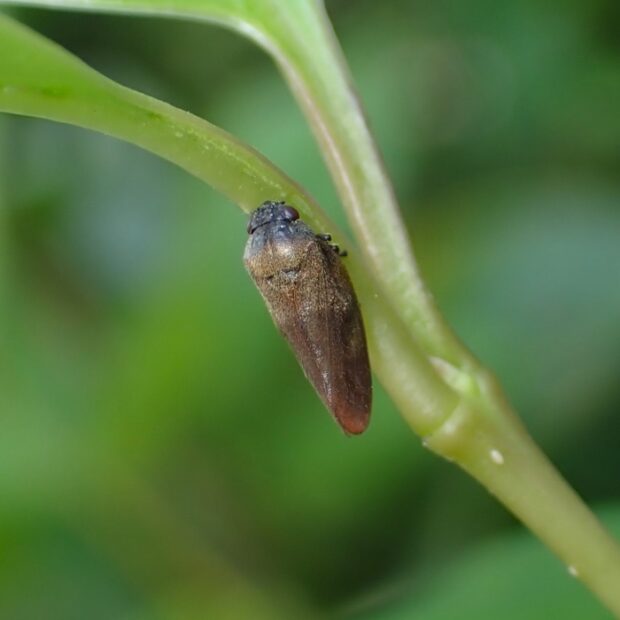 頭部が小さいアワフキムシ。 頭部は黒色、 はねは茶色で先端は赤みを帯びまるくなっています。 草地などで見られ、 ピョンと飛びはねて逃げます。