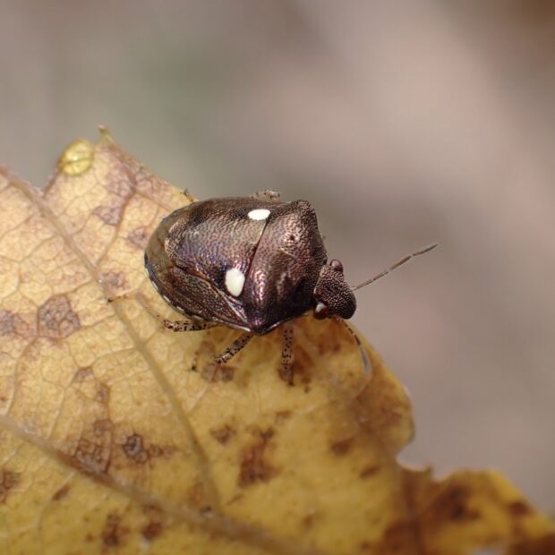 別名ツヤマルシラホシカメムシ。 草地で普通に見られる丸い体型のカメムシ。 小楯板基部にある黄白色の紋が大きく、 胸部が両側にあまり張り出さないことが特徴です。 シラホシカメムシの仲間は似ているので注意が必要。
