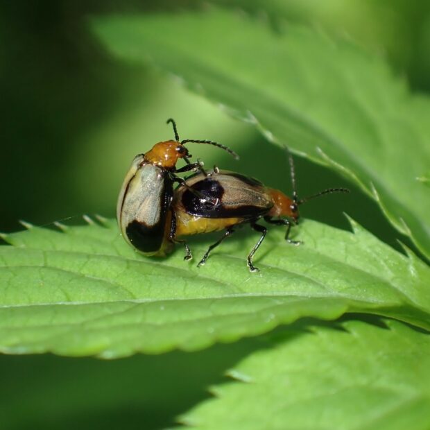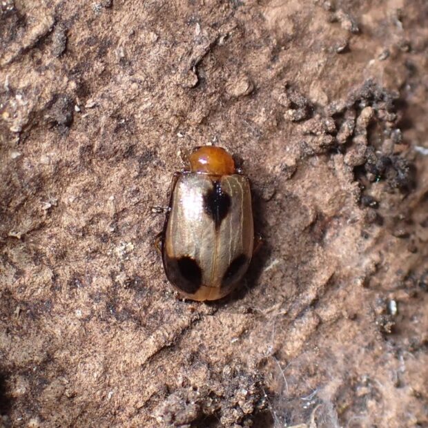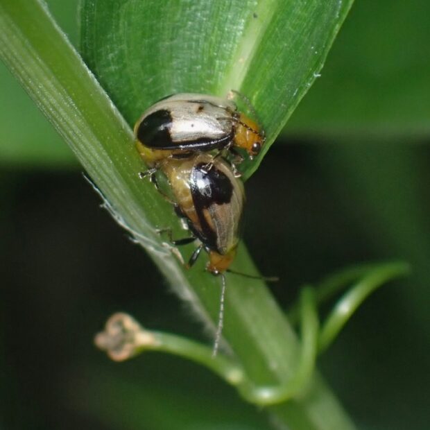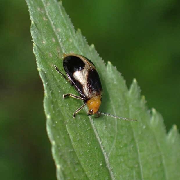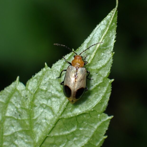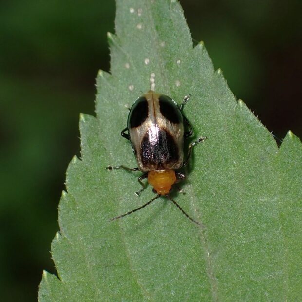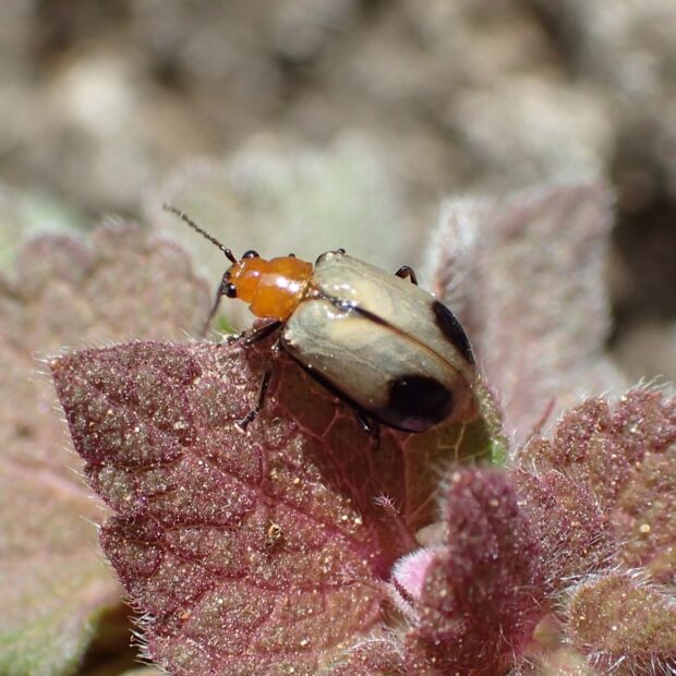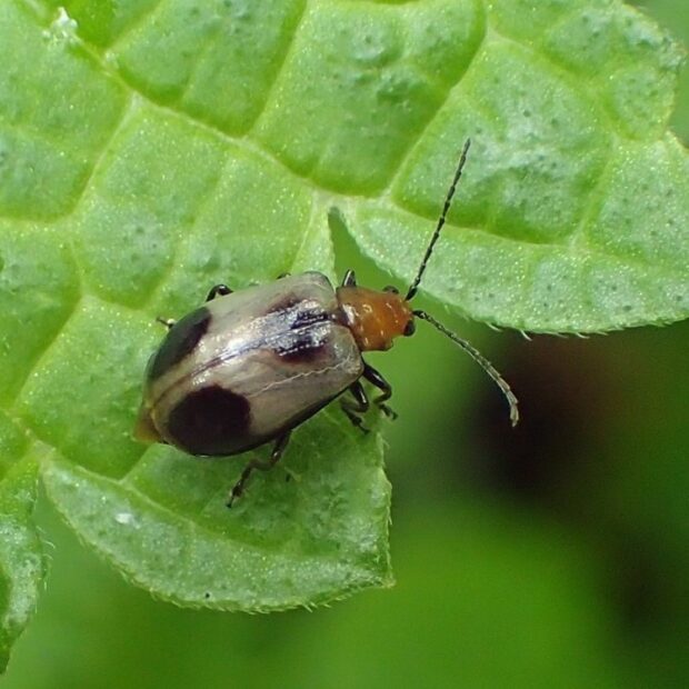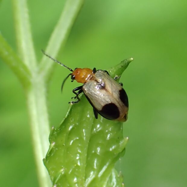 頭部、 胸部はオレンジ色、 グレーの上翅に2~3個の黒い紋があるハムシ。 黒い紋がないのもおり、 紋には変異があります。 アマチャヅルやカラスウリなどで見られます。