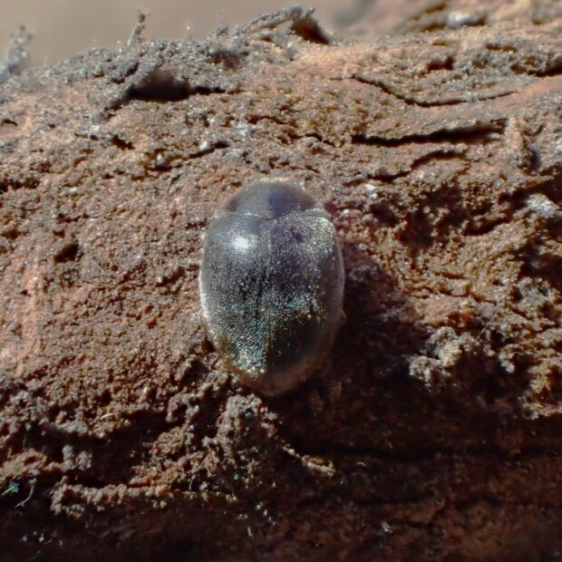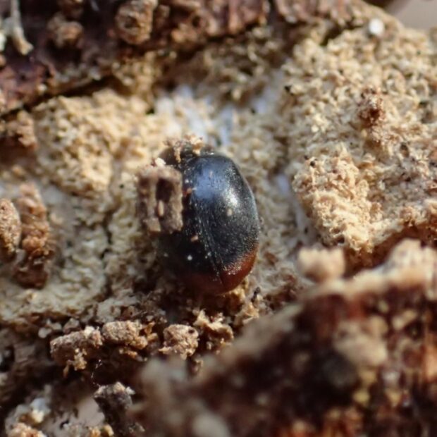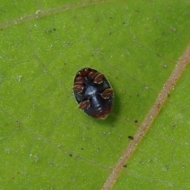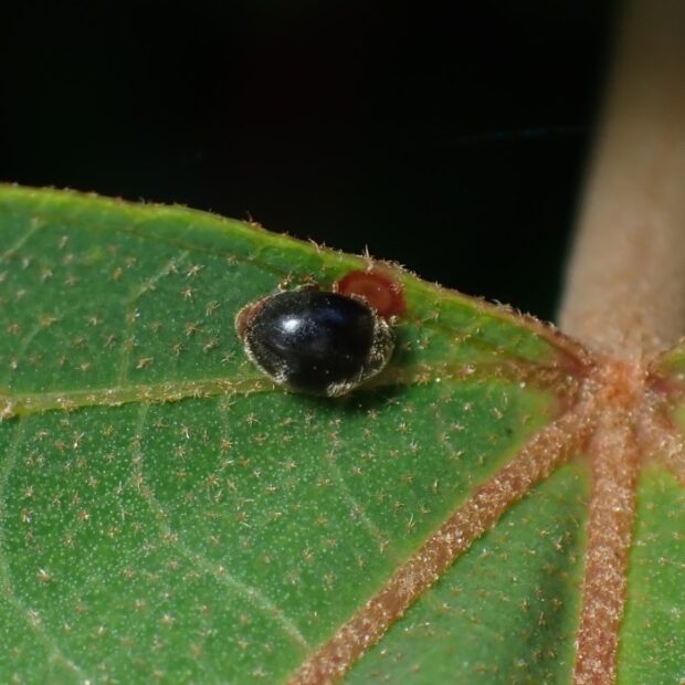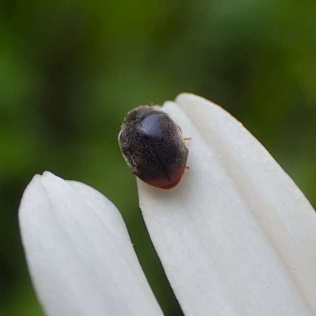 黒い小さなヒメテントウの仲間。 上翅(じょうし)は黒く短い毛が密生し、 はねの先がオレンジ色。 頭部はオスはオレンジ色で、 メスは黒色です。 幼虫は白いモコモコのロウ物質におおわれカイガラムシのような姿。