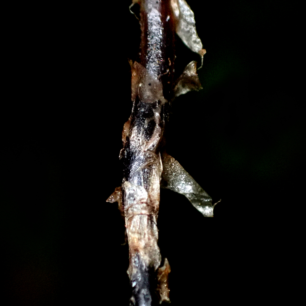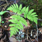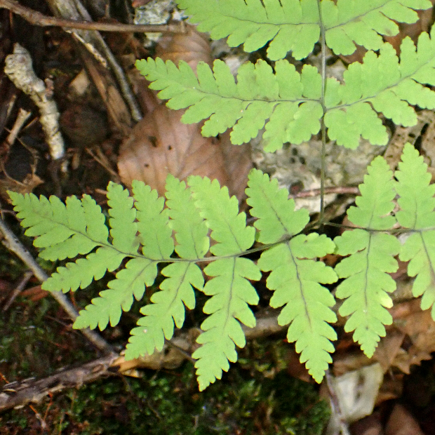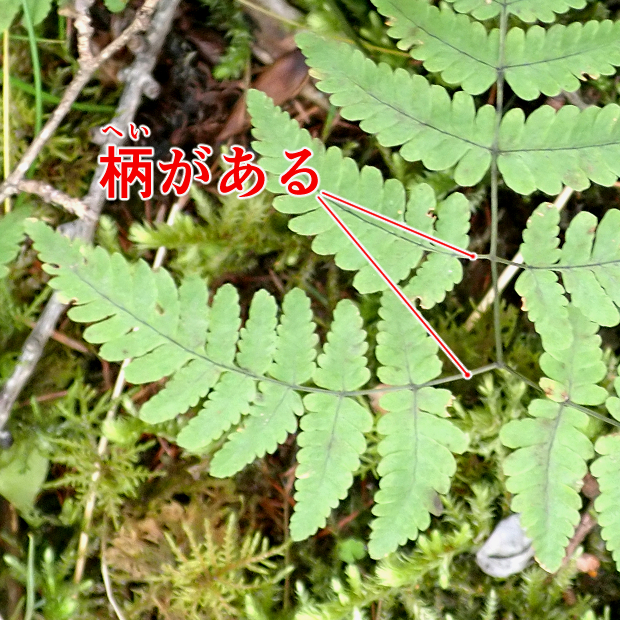 下から2番目の大きな切れ込み(羽片)にはっきりとした柄があるタイプ。 ウサギシダの変種(へんしゅ : 亜種ほどではないけど同種とするには違いがあるもの)とする考えもありますが、 最近はウサギシダに含められて区別しないことが多いです。