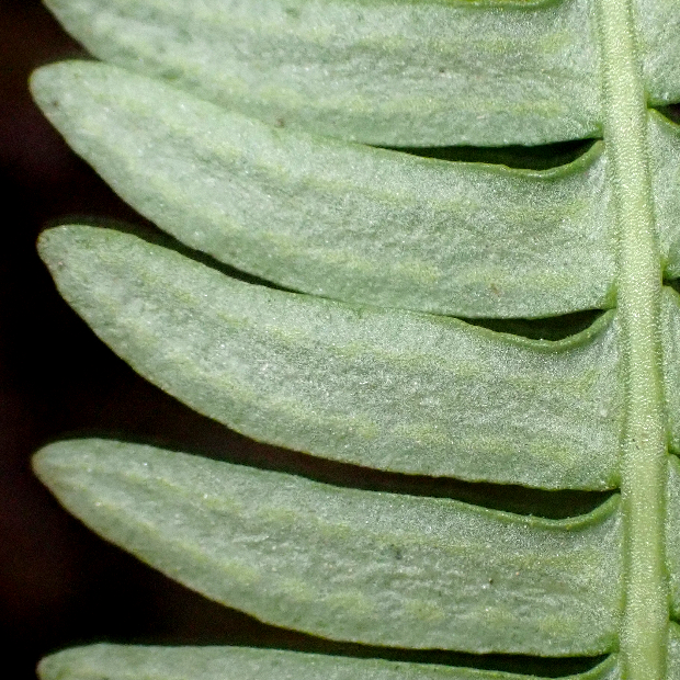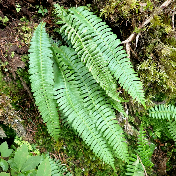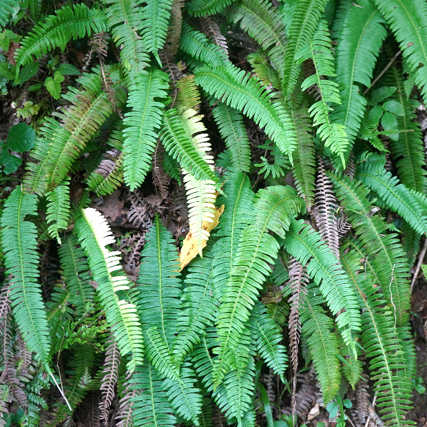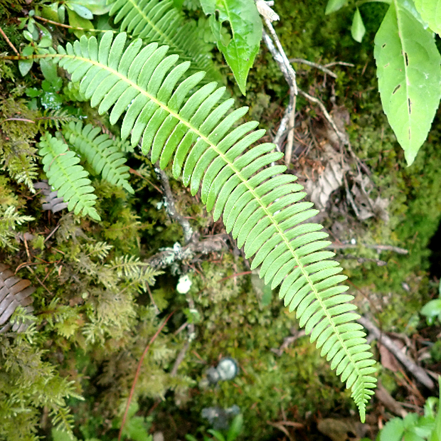 山の斜面に葉を垂らしていることが多いシダ。 より普通に見られるシシガシラに似ていますが、 胞子葉を垂らすこと、 葉柄の鱗片が幅広いことなどが違いです。 筬(おさ)は織物を織るときに使う道具のことで、 葉の形がこれに例えられました。 日本固有種です。