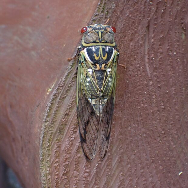 体は黒く、 黄色や赤褐色の紋がある山地性のセミ。 大型。 頭を下にして逆さにとまり、 「ギー」と鳴きます。 北海道では平地でも見られます。