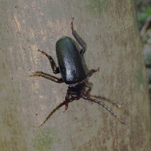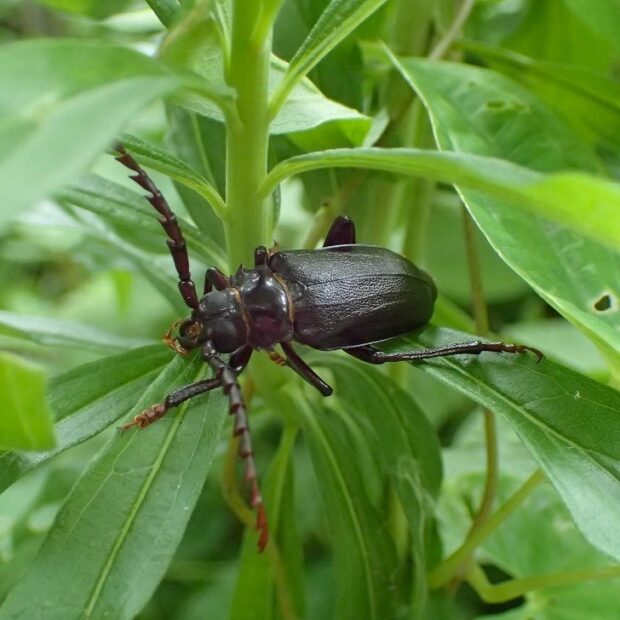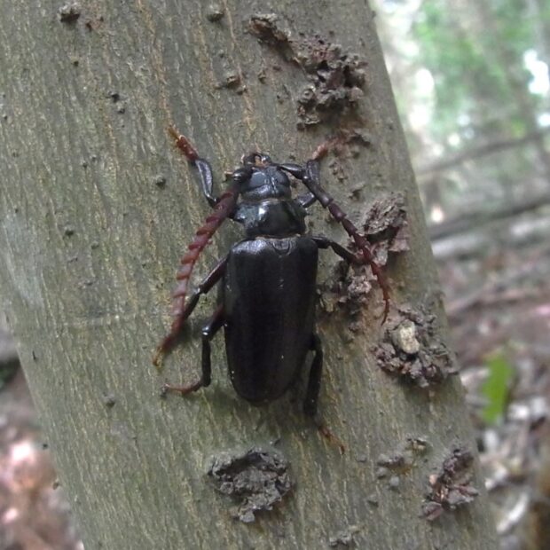 体は黒っぽく、 触角がのこぎりのようにギザギザになっているカミキリムシ。 のこぎり状の触角は、 メスは細く、 オスはより太くなります。 平地~山地にかけて生息し、 いろいろな樹木で普通に見られます。 夜は明かりにやって来ます。