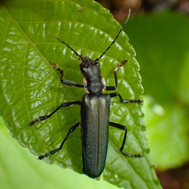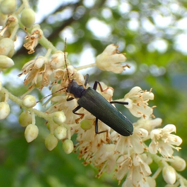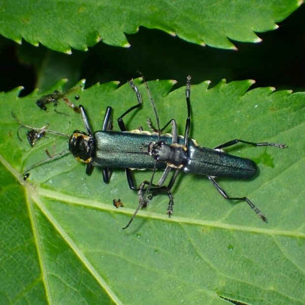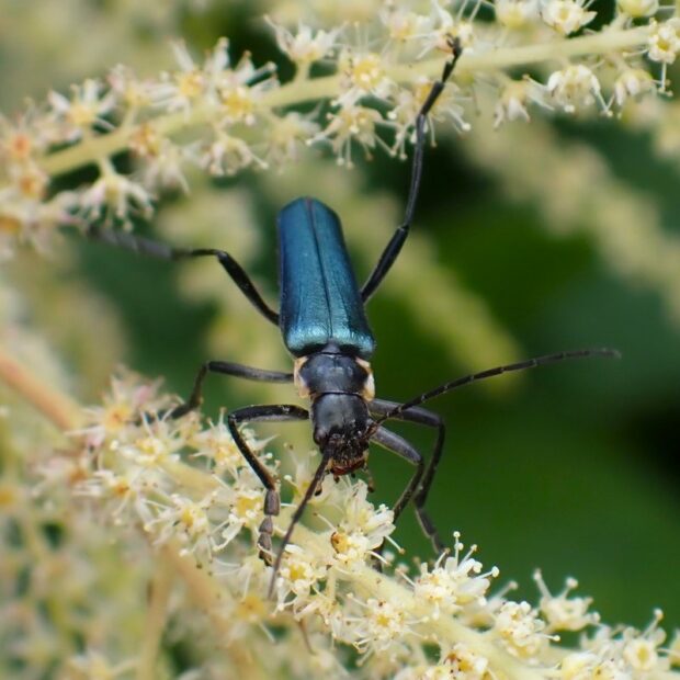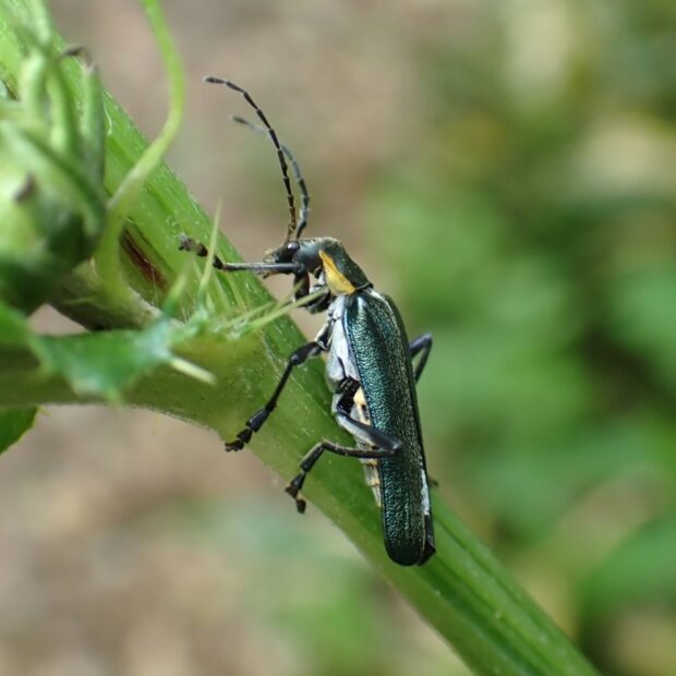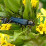 初夏に多いジョウカイボンの仲間。 上翅(じょうし)は青く、 前胸の両側が黄色く縁どられます。 花にやって来て蜜や花粉を食べますが、 主に昆虫を食べます。 ジョウカイボンは、 糸状の長い触角をもち、 体が柔らかいのが特徴。