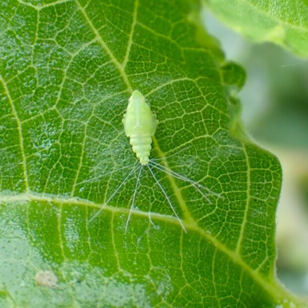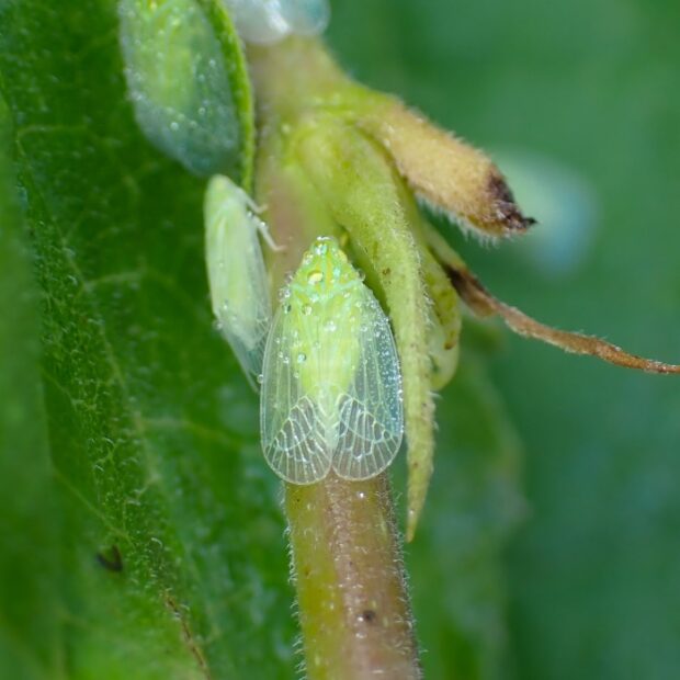グンバイウンカの仲間。 黄緑色で、 透明のはねには鮮やかな緑色の筋(翅脈=しみゃく)があります。 幼虫はお尻に白い毛が生えており、 ピョンと跳ねて逃げます。