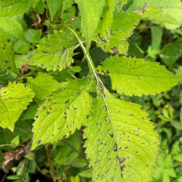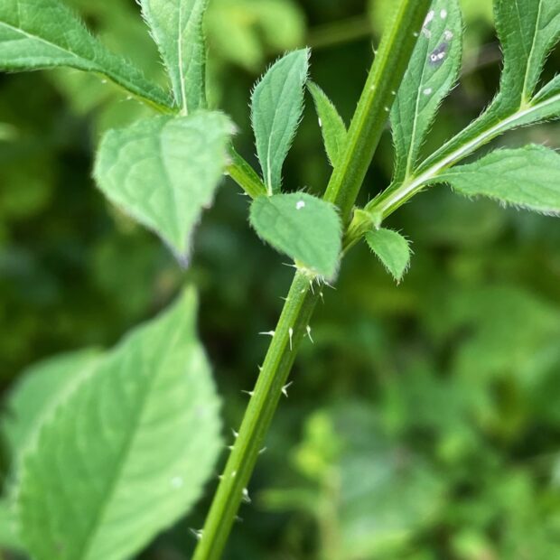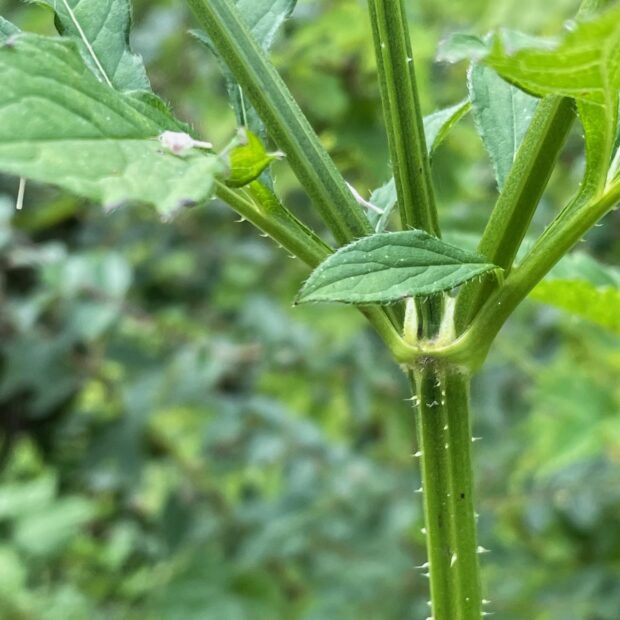 オオハンゴンソウの花は黄色、 ナベナの花は薄紅紫色で、 見分けがつきます。