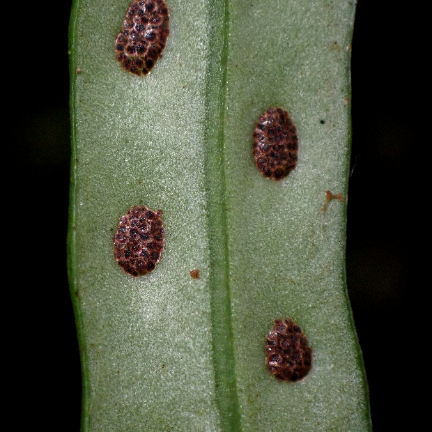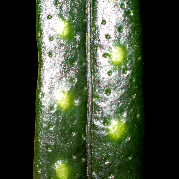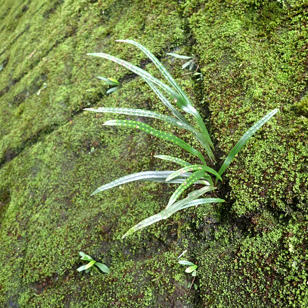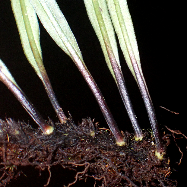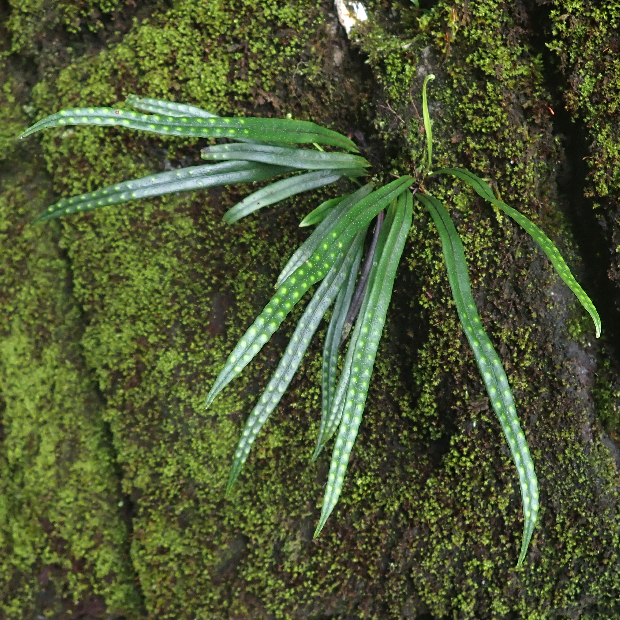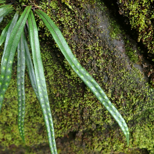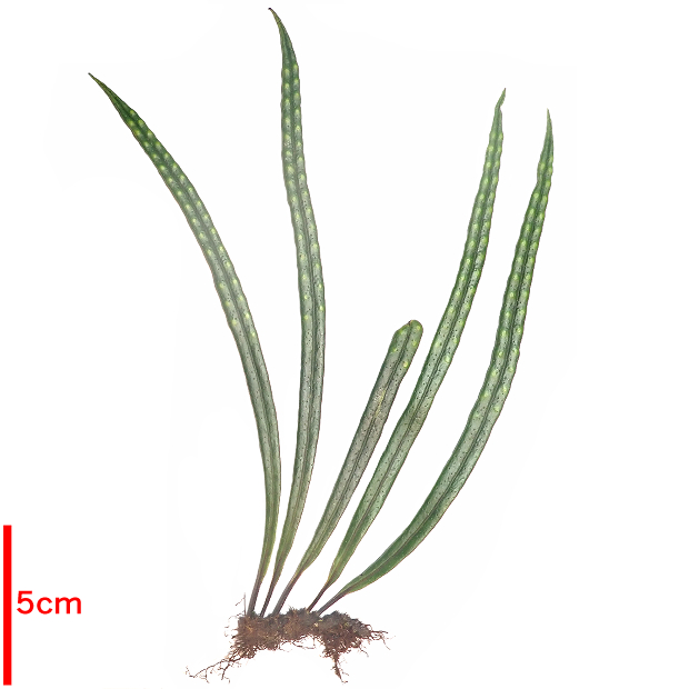 山地に生え、 岩などから葉を垂らすノキシノブの仲間のシダ。 この仲間の中では、 葉柄がふつう黒っぽくて長く、 根茎を長めにはうことがわかりやすい違いです。 珍しいシダというわけではなく、 各地でよく見られます。