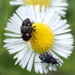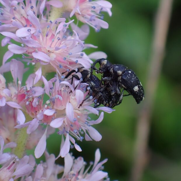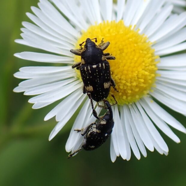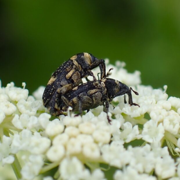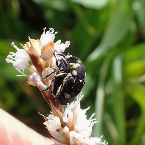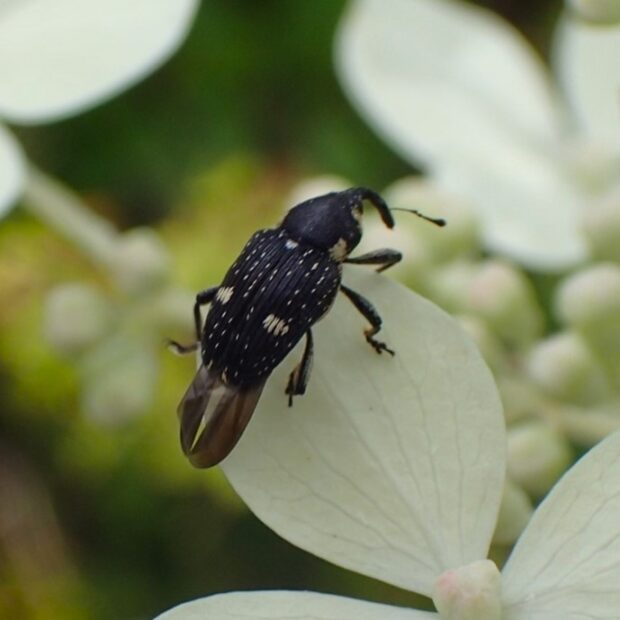 黒色で淡い黄色い紋があるヒメゾウムシの仲間。 夏、 山で見られることが多く、 いろいろな花に集まり、 よく飛びます。