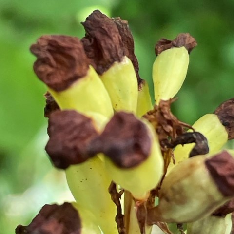 種子 発芽時にはクヌギタケから栄養をもらいます。 発芽した後、 茎をのばして、 花を咲かせる時期には、 ナラタケの菌糸とつながって、 栄養をもらいます。