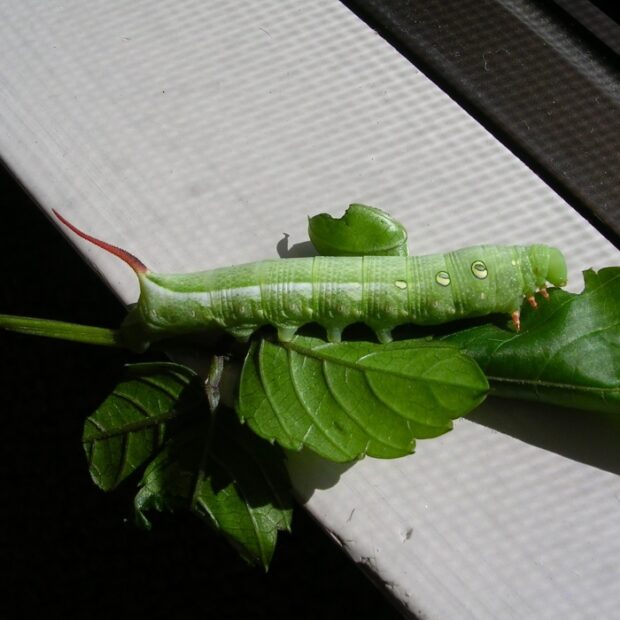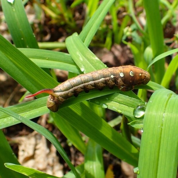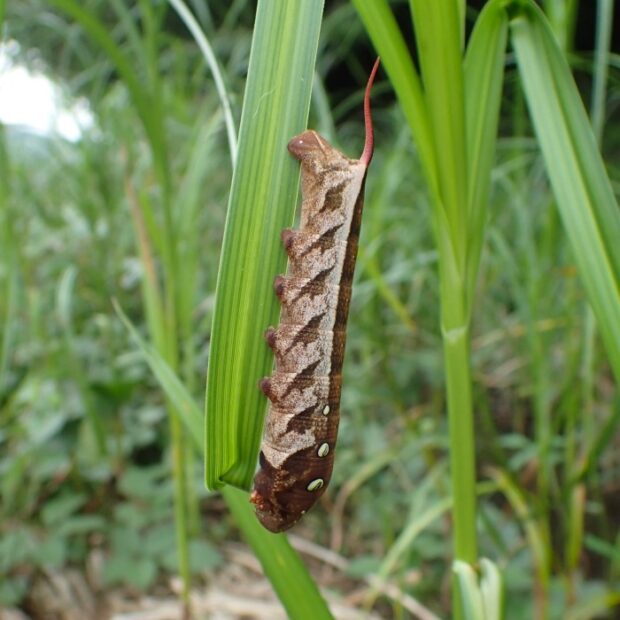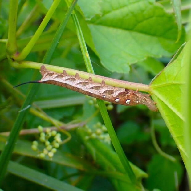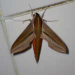 はねに筋模様があり、 とまると三角形にみえるスズメガの仲間。 明かりにやって来ます。 幼虫は褐色と緑色の2つのタイプがあります。