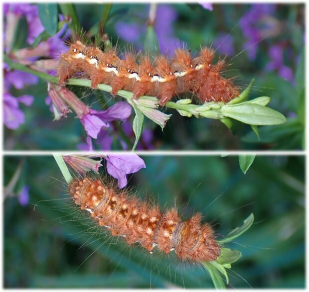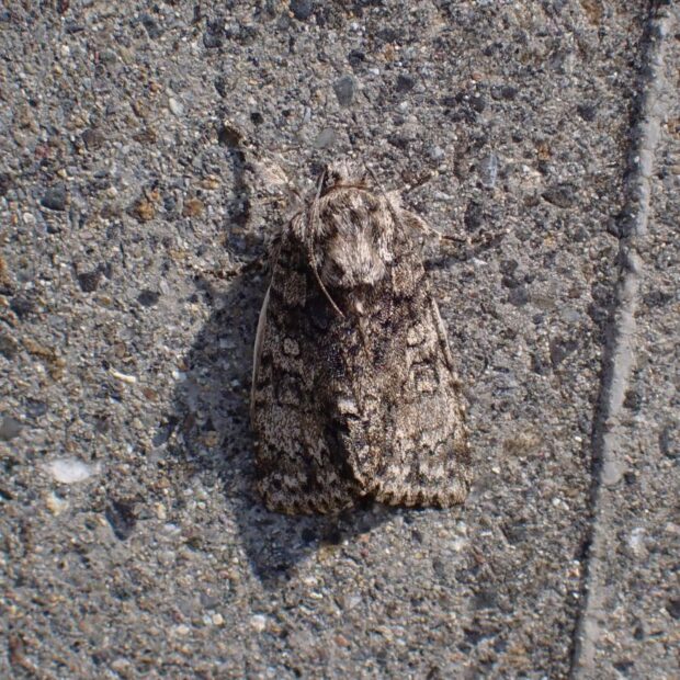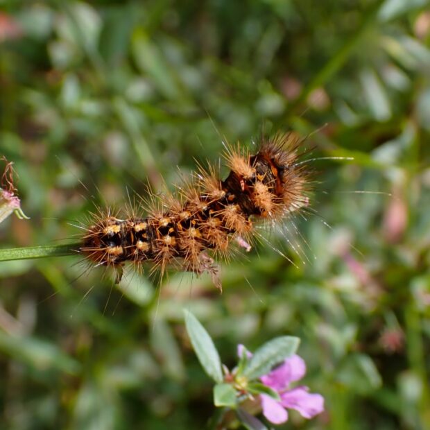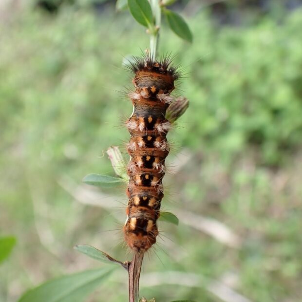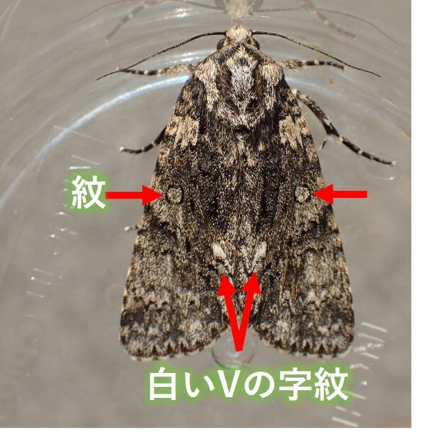 ヤガ科ケンモンヤガの仲間で、 ごく普通に見られます。 夜行性ですが、 昼間、 幹などでじっとしている姿を見ることができます。 幼虫は、 ケンモンヤガの仲間では珍しい毛虫型で、 黒色~褐色まで色の変異があります。