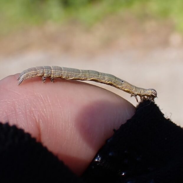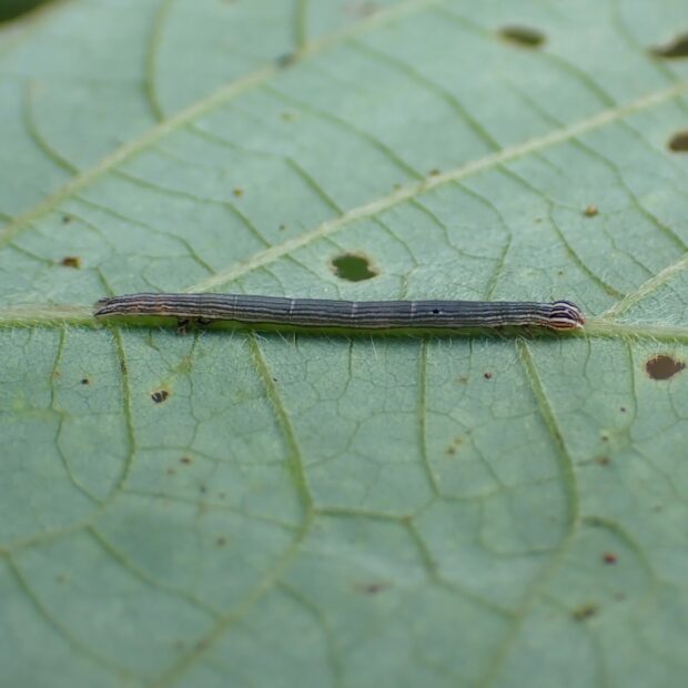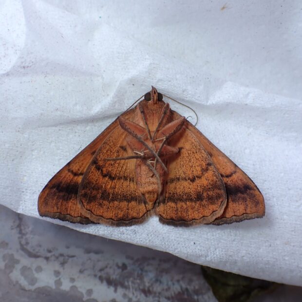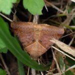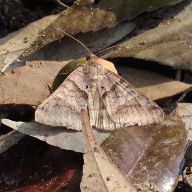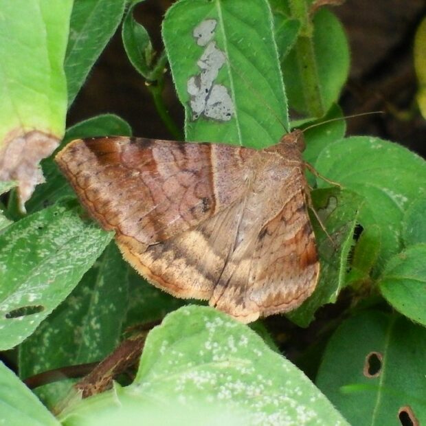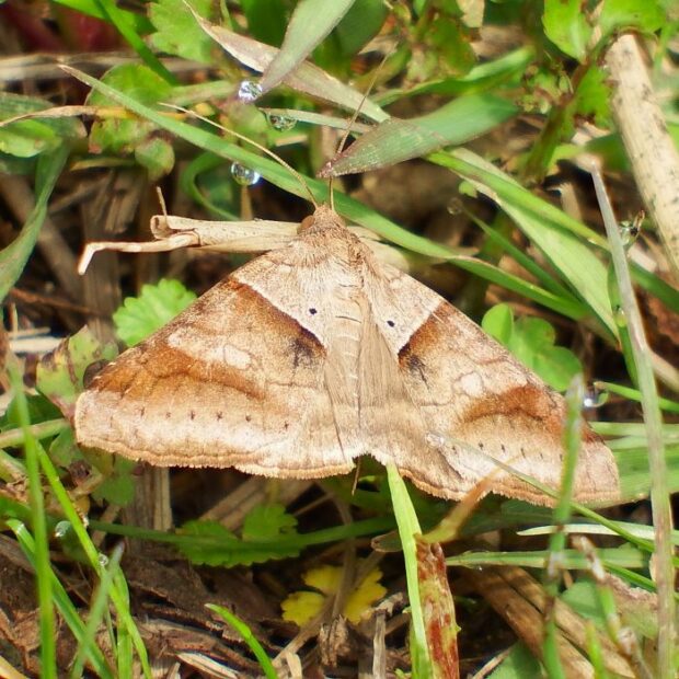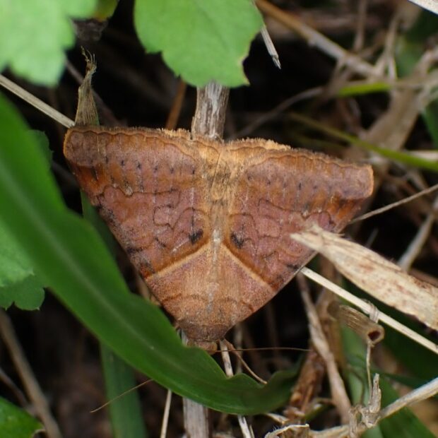 ヤガ科のシタバガの仲間。 茶色の前ばねにV字の帯が目立ち、 複雑な模様をしています。 昼間に三角形にはねを閉じてとまっている姿を見ることができます。