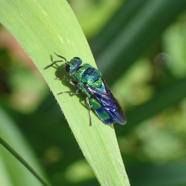 青や緑の金属光沢をもつイラガセイボウという寄生バチが、 イラガのマユに産卵します。 セイボウは、 「飛ぶ宝石」「宝石蜂」とも呼ばれる美しいハチです。 イラガセイボウの幼虫はマユの中のイラガの前蛹を食べて成長し、 成虫になるとマユに穴を開けて出てきます。