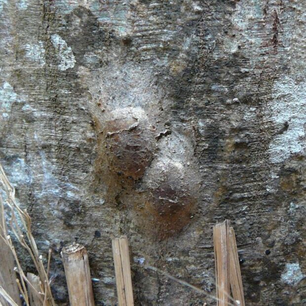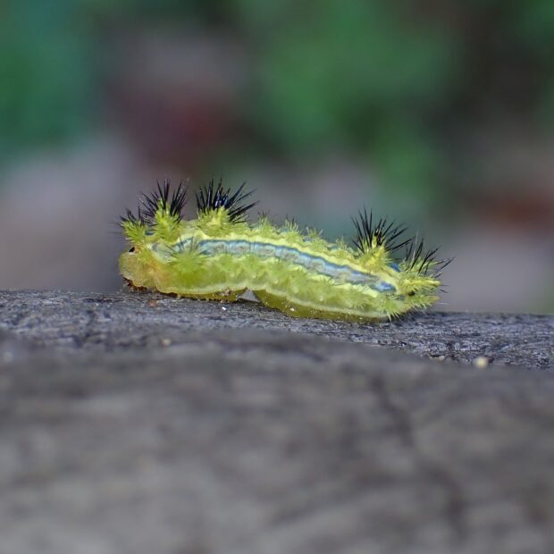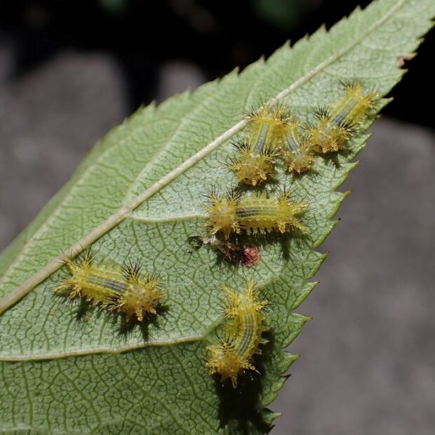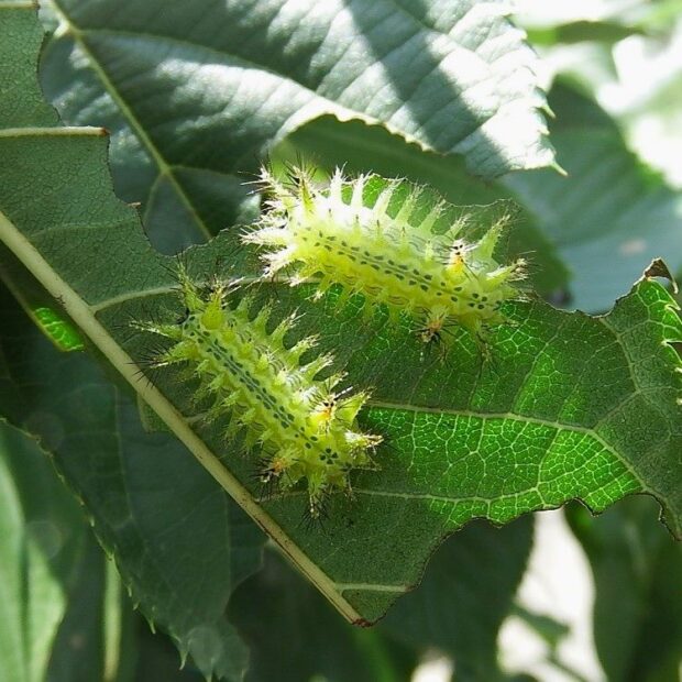 幼虫は体の表面に毒のある毛をもちます。 「イラムシ」「デンキムシ」と呼ばれ、 幼虫に刺された瞬間、 電気が走ったような痛みがあります。 皮膚炎、 腫れ、 痛みを生じますので、 絶対に触らないようにしてください。 刺された場合は、 粘着テープで毛を取り除き、 流水で洗い流してください。 症状が長引くことは少ないです。
