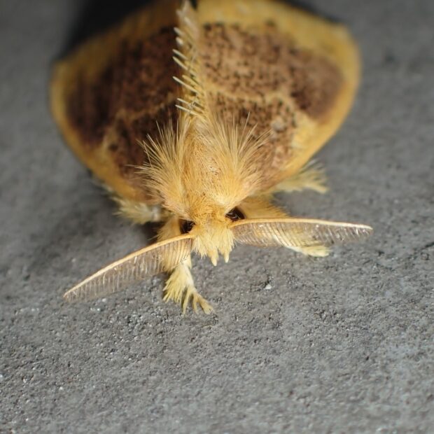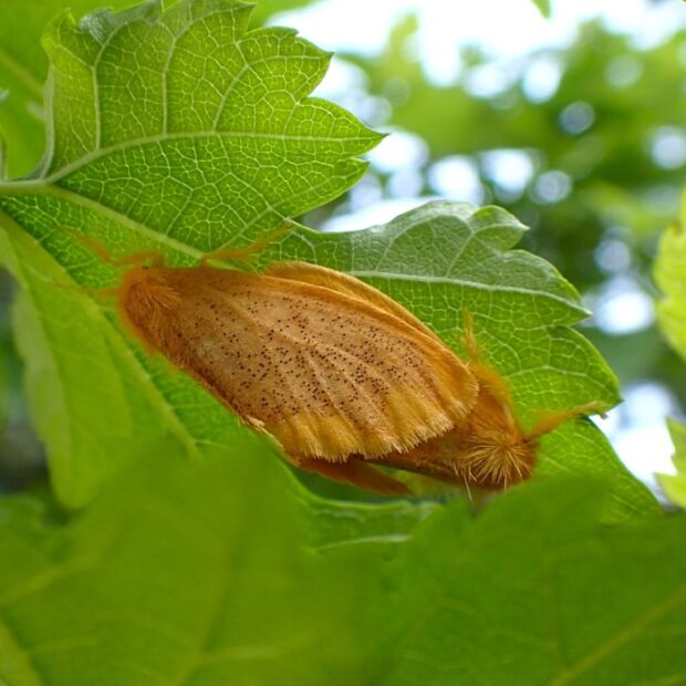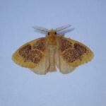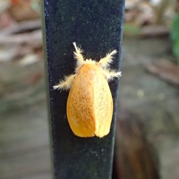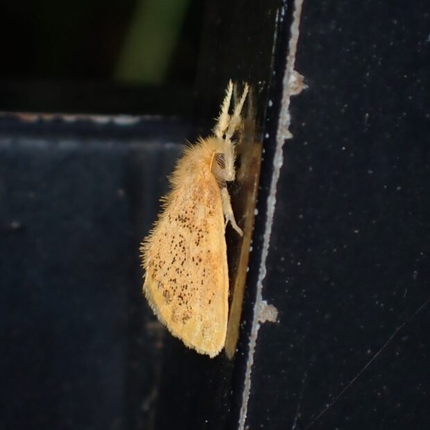 黄色いはねに黒い点々があるドクガの仲間。 はねの色や模様は変異があります。 公園や庭木などで普通に見られ、 明かりにやって来ます。 幼虫越冬。