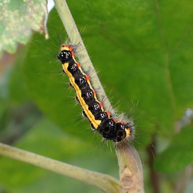 幼虫に毒のある毛(毒針毛)があるので触らないでください。 卵、 繭、 成虫にも毒針毛が付着しています。 刺さると痛みとかゆみがあり、 皮膚炎をおこすことがあります。 刺さった場合は、 粘着テープで取り除き、 流水で洗い流してください。