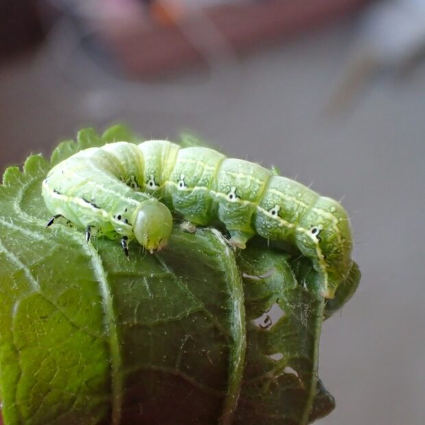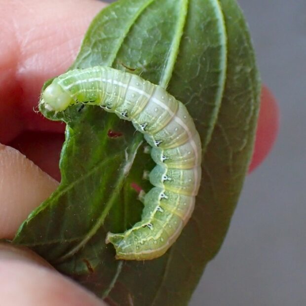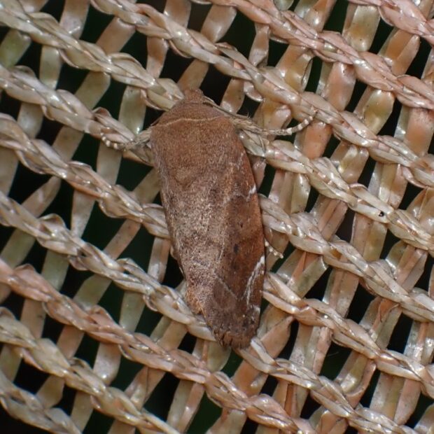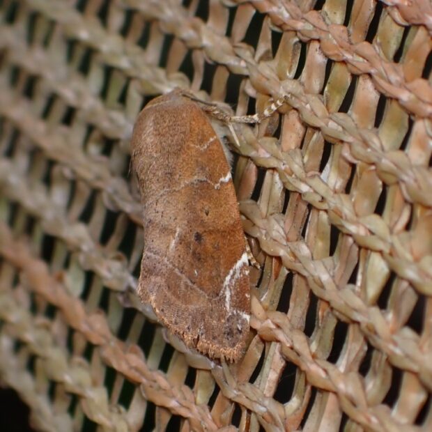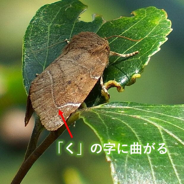 普通に見られるヤガの仲間。 成虫は茶色いはねに白い線が走り、 黒い点があります。 幼虫はニレ科植物の葉を食べます。