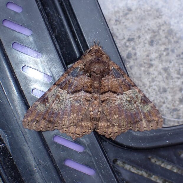 ヤガ科の仲間。 普通に見られ、 はねの色や模様は変異が大きいです。 明かりにやって来ます。
