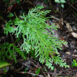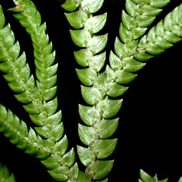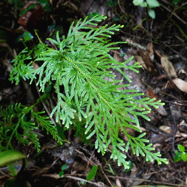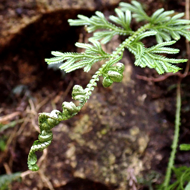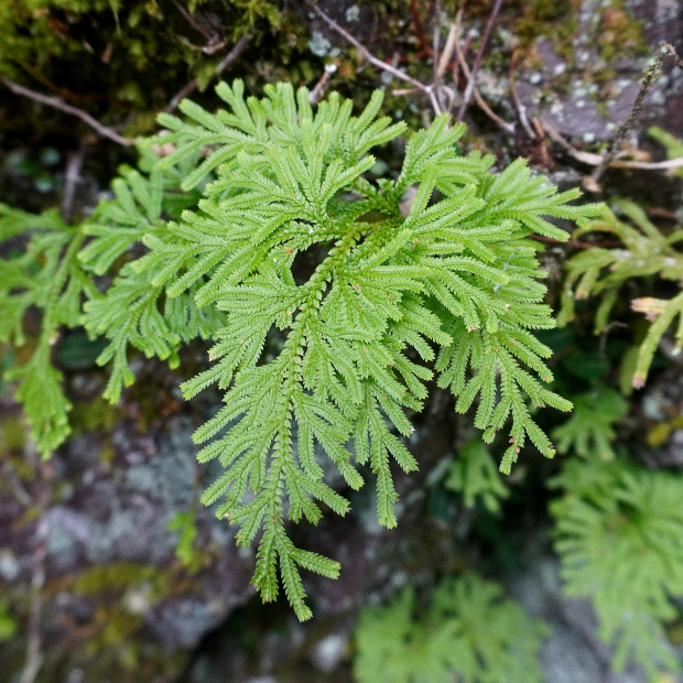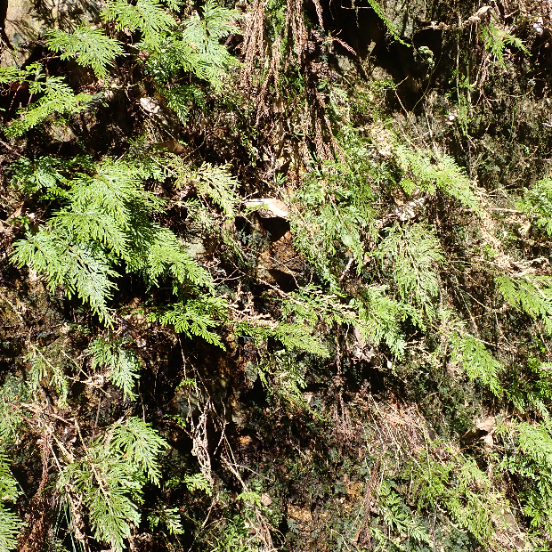 崖に多い檜葉(ひば : ヒノキの仲間)のような形のシダ植物です。 近い仲間のイワヒバと違って枝は放射状に広げず、 一方向にのみ伸ばします。
