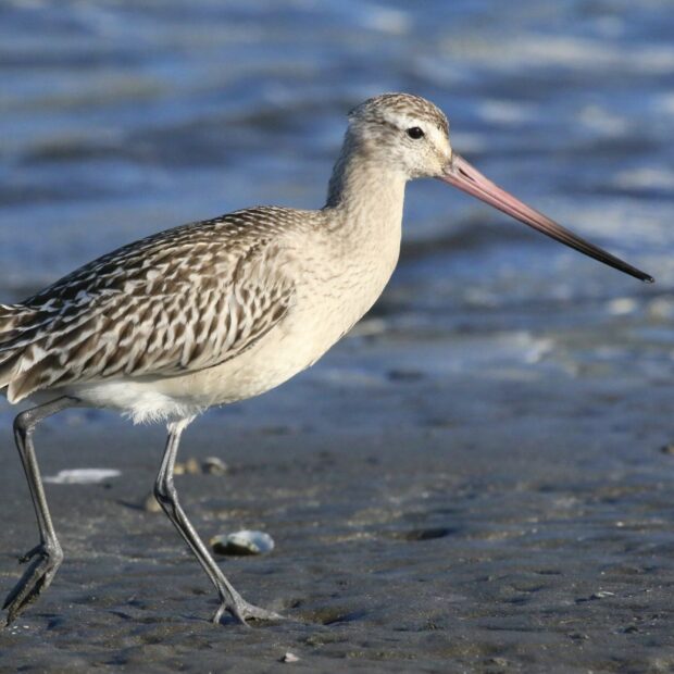 砂浜を歩き回りながら、 長く上にそった嘴を使ってゴカイや貝類を捕食します。