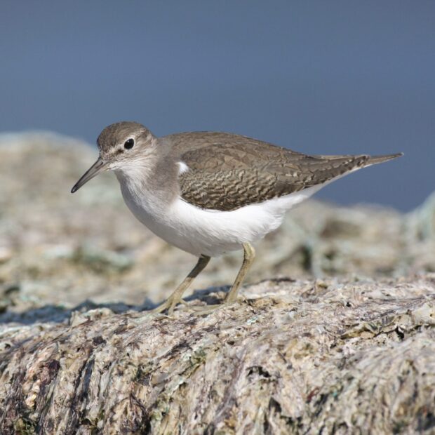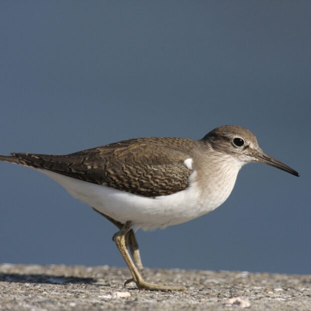 背面は茶色で、 体の下面は白色、 嘴と足はわずかに緑を帯びた黄色です。 体下面の白色が胸で背面側に入り込んでいるため、 ほかの似ているシギ類と区別できます。
