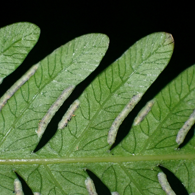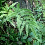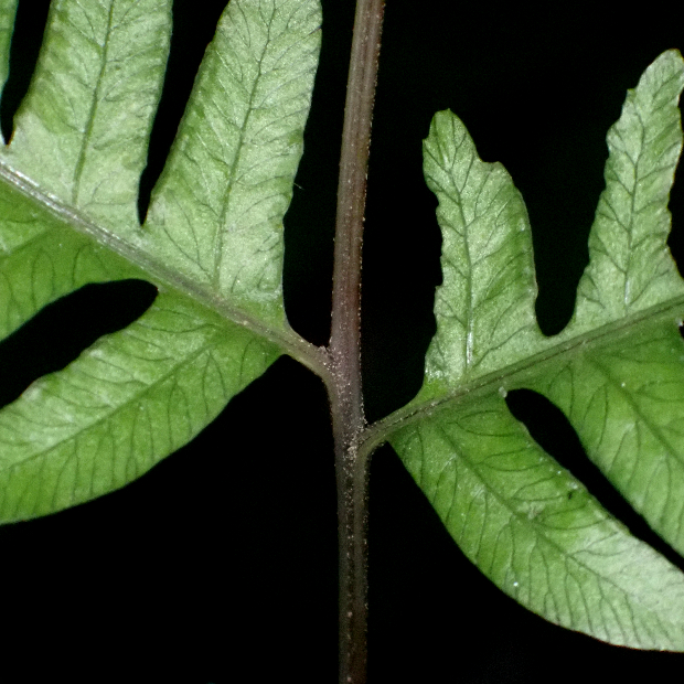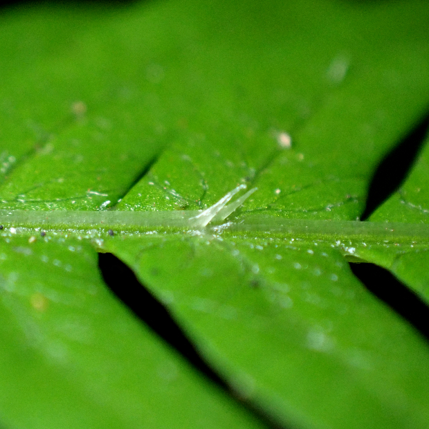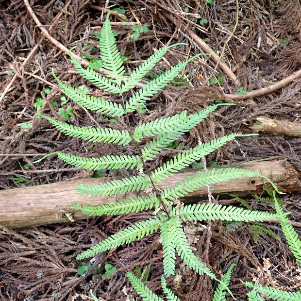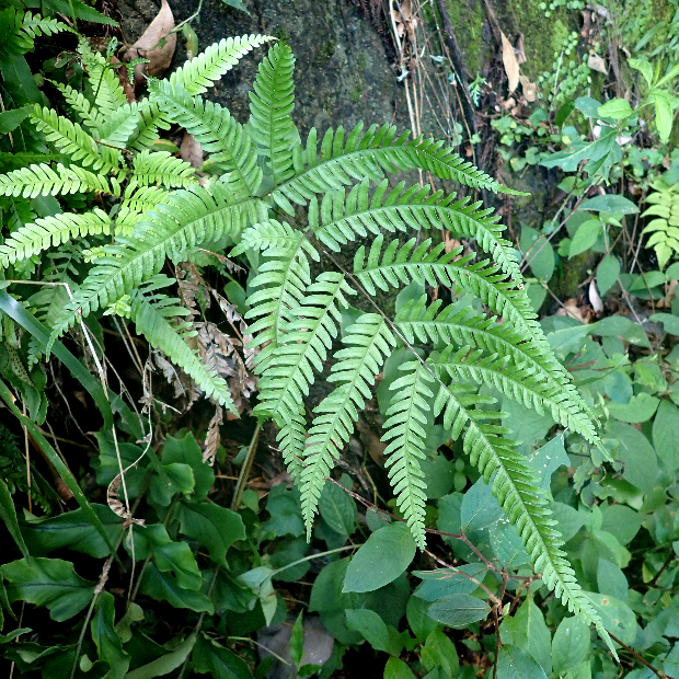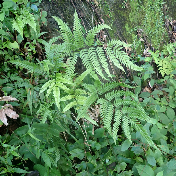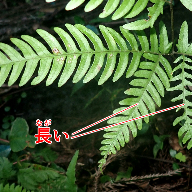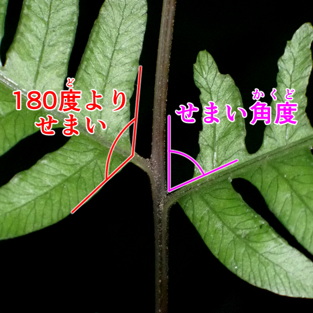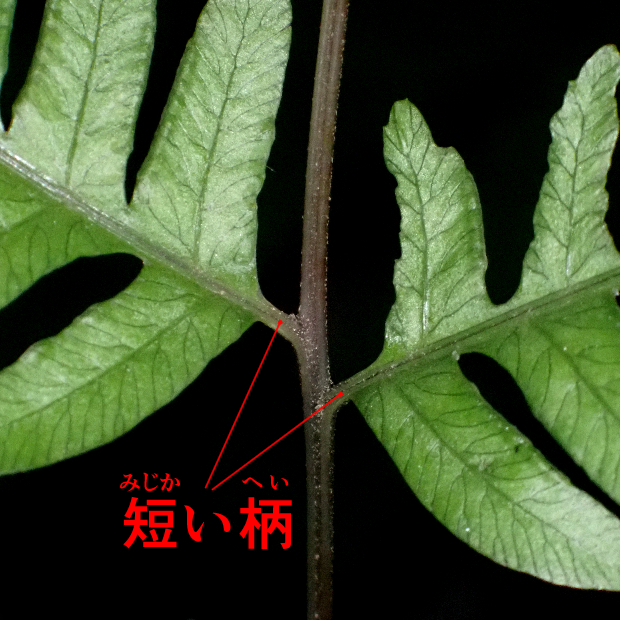暖かい地域に多いハチジョウシダの仲間のシダ。 この中ではひょろひょろな感じがして、 羽片の基部に柄があることなどが特徴で、 離島を除くと日本で最もよく見られます。