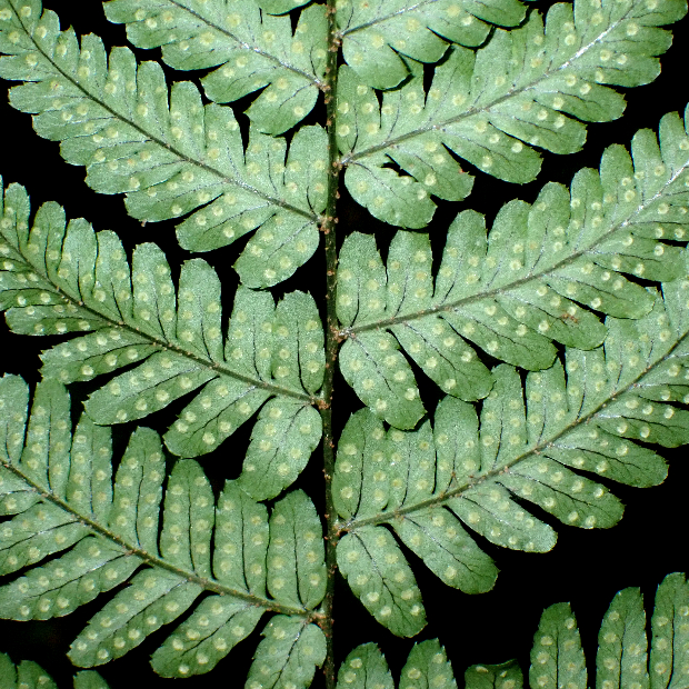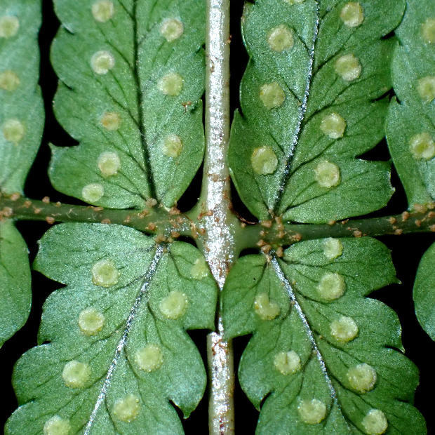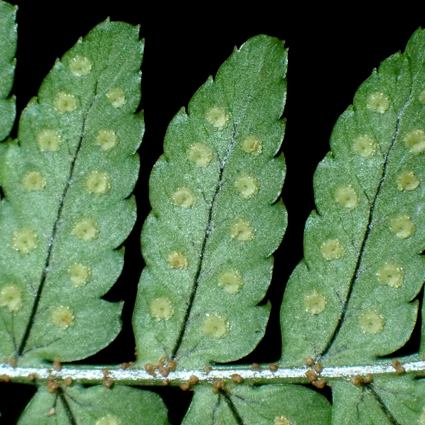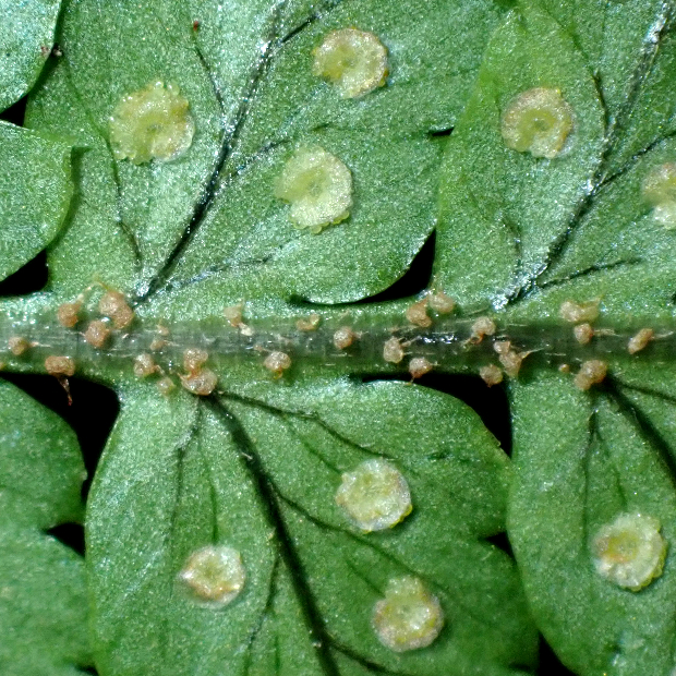 胞子のう群は円形で、 フチと脈の中間につく。