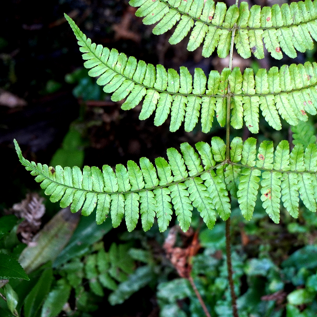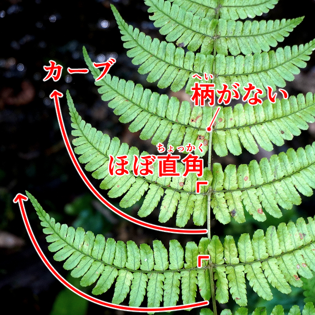 羽片は葉軸に対して直角につき、 基部にはっきりとした柄がない。 よく途中でカーブする。