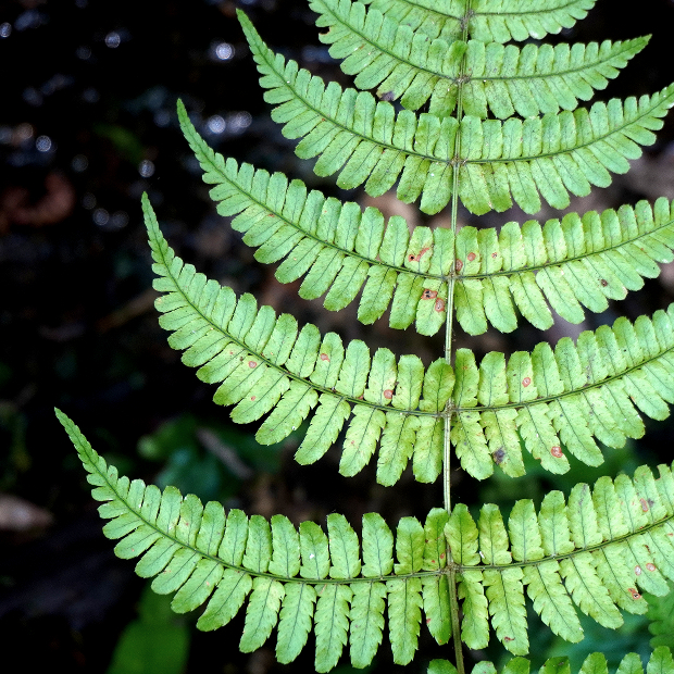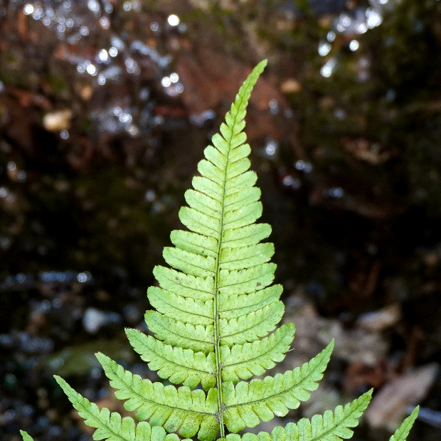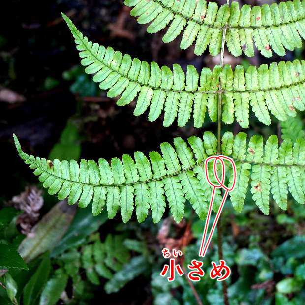 最下羽片の葉軸に接する下向き小羽片は、 となりの小羽片より小さい。