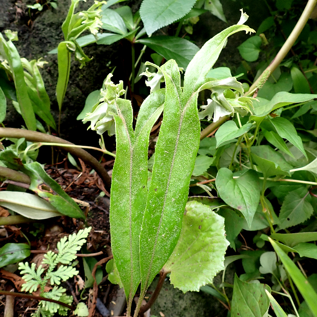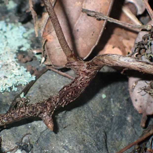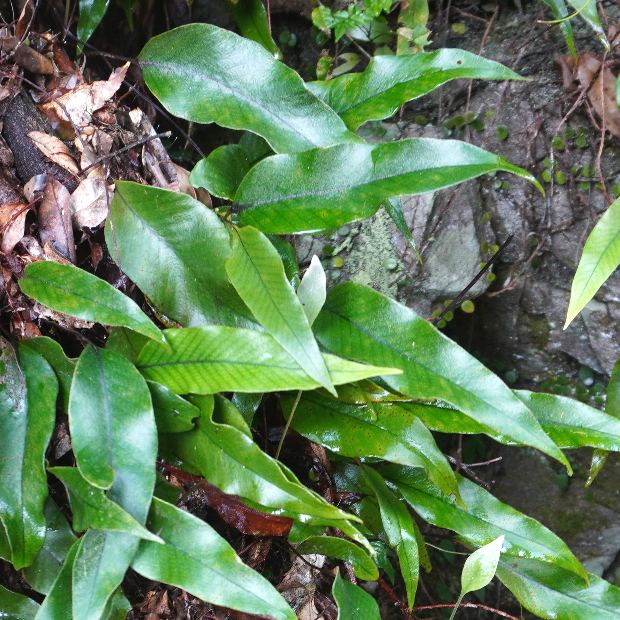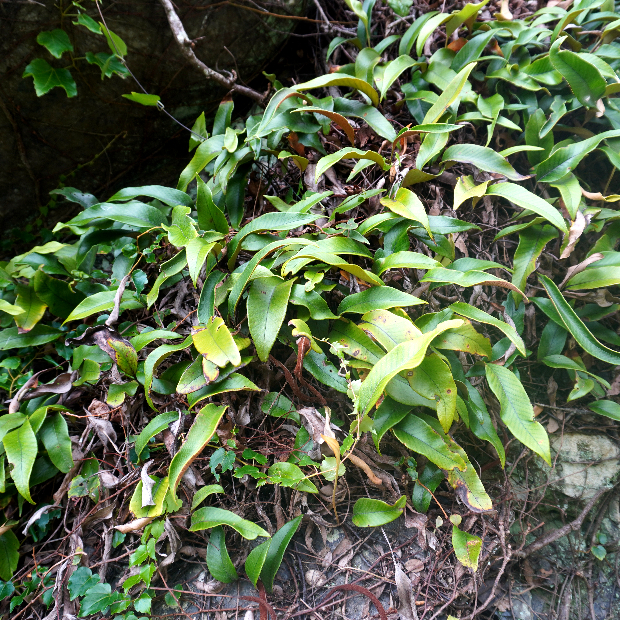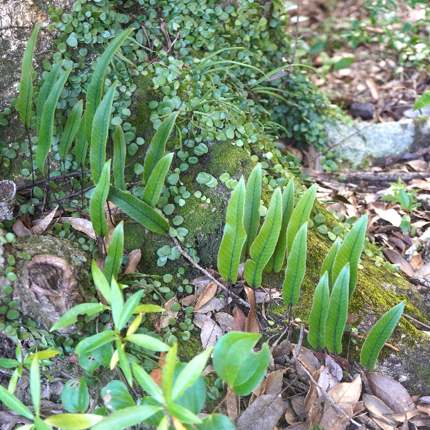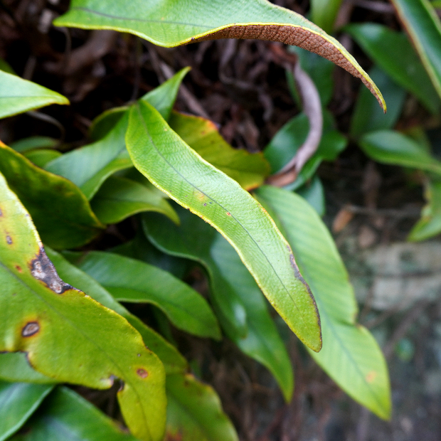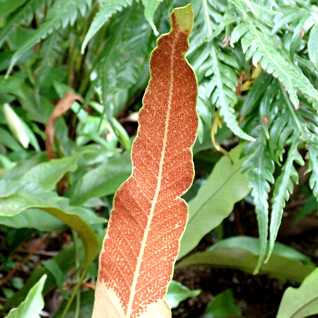 暖かい地域でごく普通に見られる葉っぱ。 こんな姿ですがシダの仲間で、 葉裏に胞子のうをびっしりつけます。 園芸でも人気で、 庭などによく植えられます。