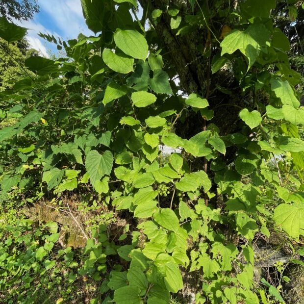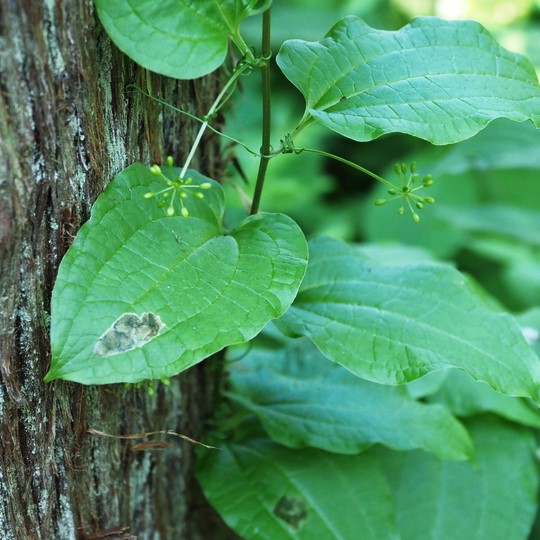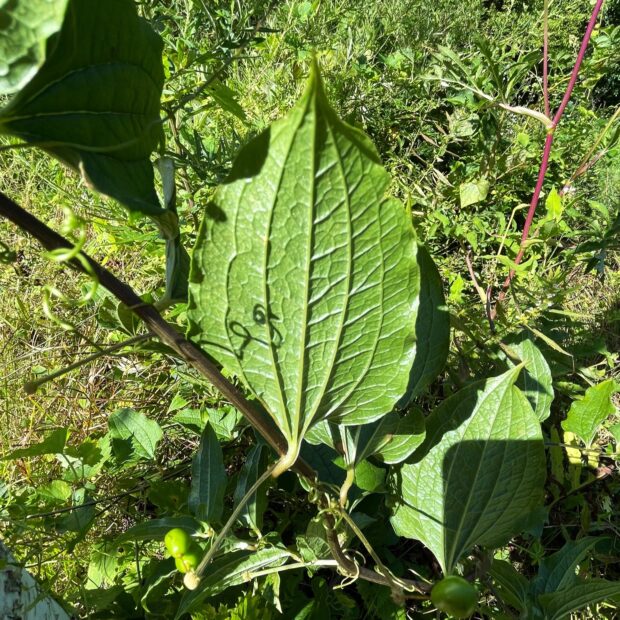 つる性の草です。 若葉がアスパラガスに似た味で美味しいということで「山菜の女王」とも呼ばれます。 初夏にチアガールが持っているポンポンのようなクリーム色の花を咲かせます。 実は晩秋に真っ黒に熟し目立ちます。