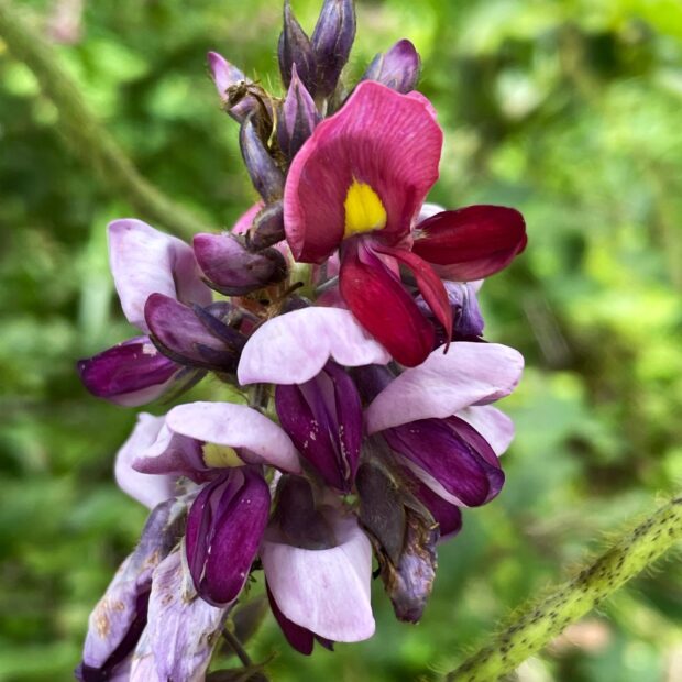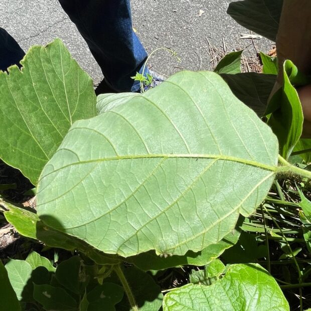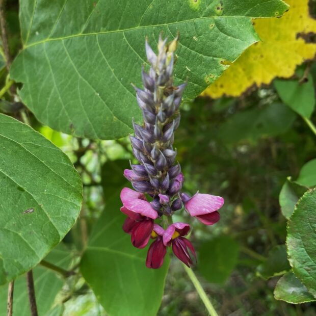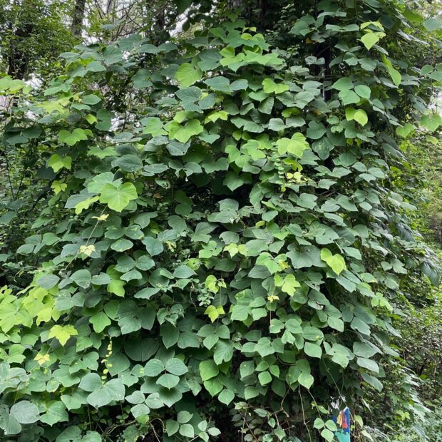 つる性の植物で成長すると茎は10m以上にもなります。 繁殖力旺盛で色んな場所を覆い尽くしています。 大きな3枚セットの葉が特徴です。 真夏に良い香りのピンク色の房状の花を咲かせます。