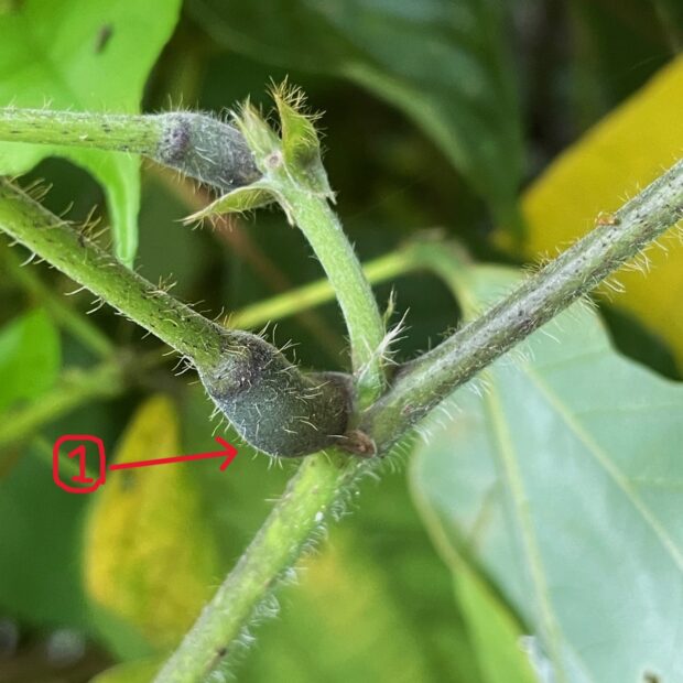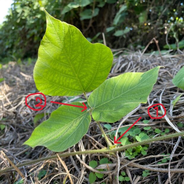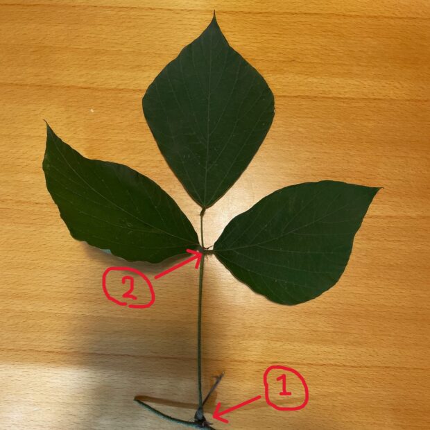 • 葉は3枚1組となっていて、 ①葉の基部と②3枚の小葉の基部の両方に丸み(葉枕)がある。