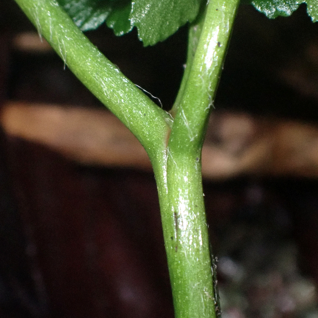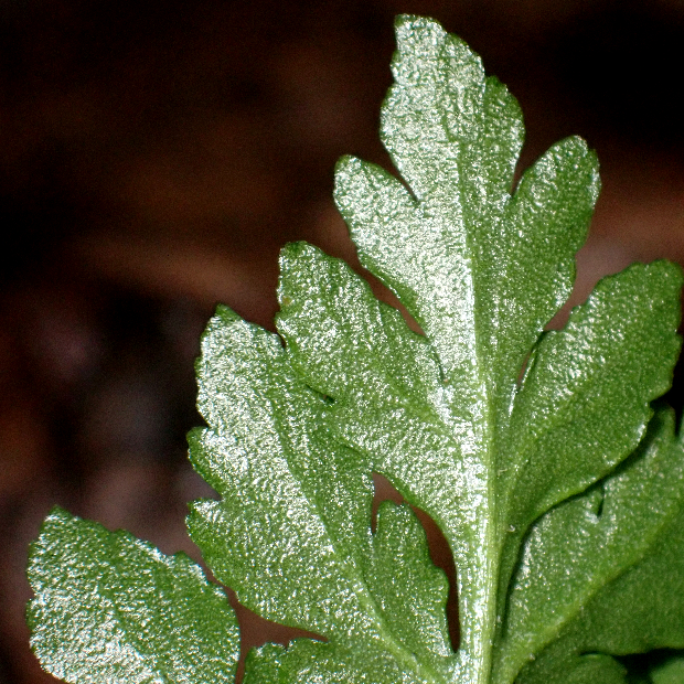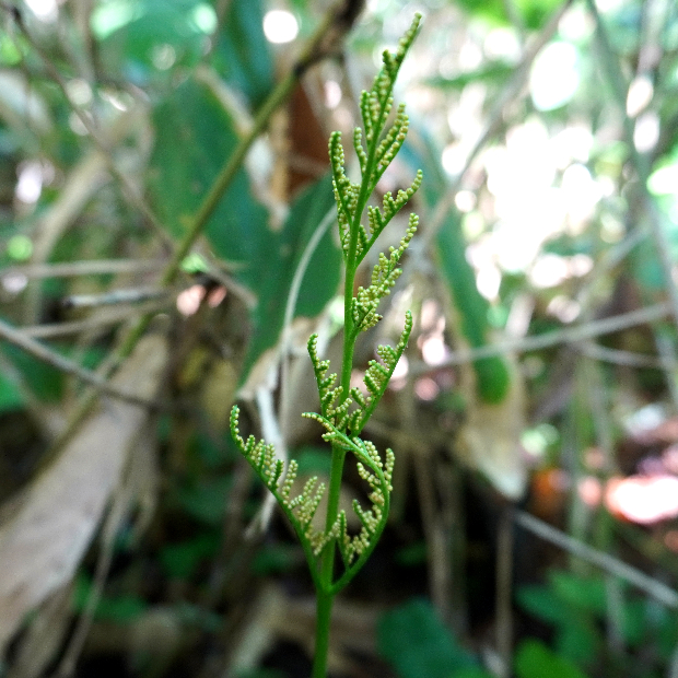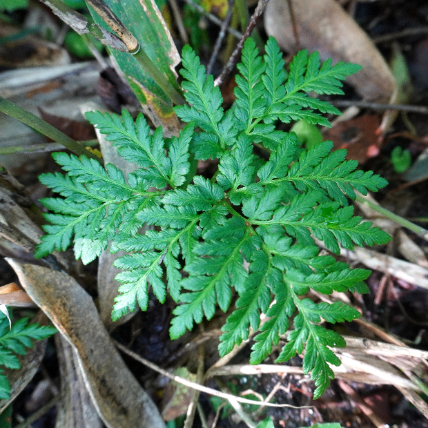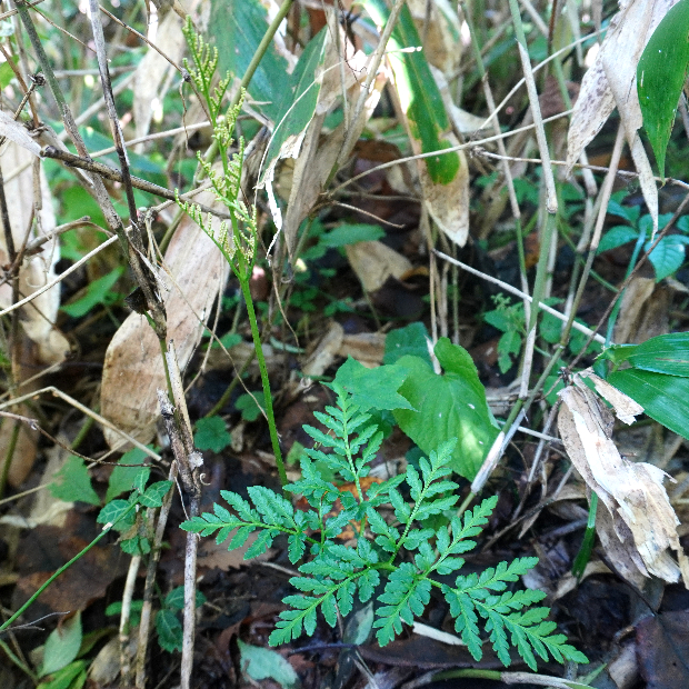 北日本に多い、 寒い季節に葉を広げるシダ。 ハナワラビの仲間は花のように見える胞子を飛ばす葉と、 光合成のみする葉が共通の柄から分かれている姿が独特です。 フユノハナワラビに似ていますが、 柄に毛が多くつきます。