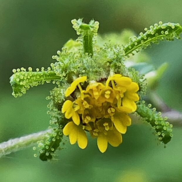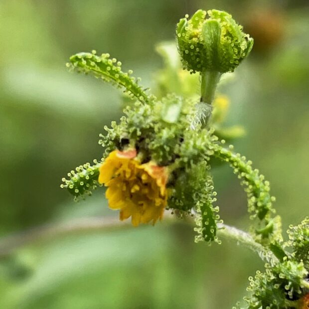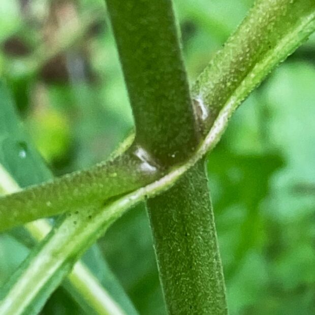 背丈が1m以上になり、 枝分かれした茎の上部にたくさんの花を咲かせます。 花のまわりには、 毛虫のような腺毛が付いていて、 さわるとべたべたします。