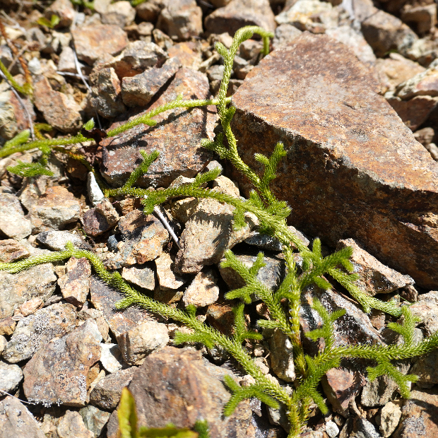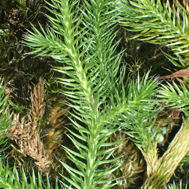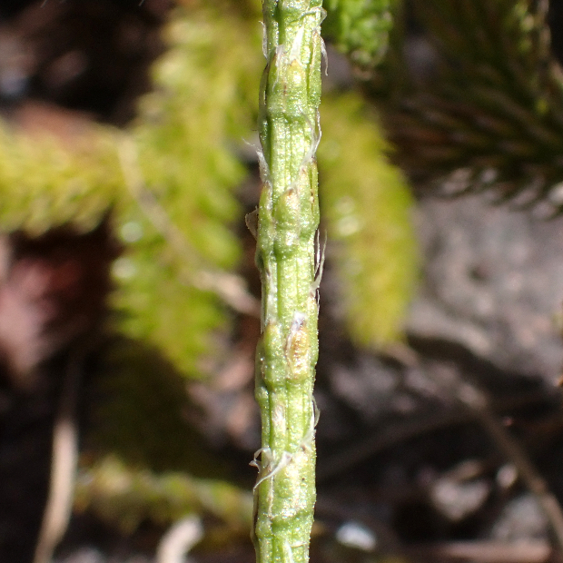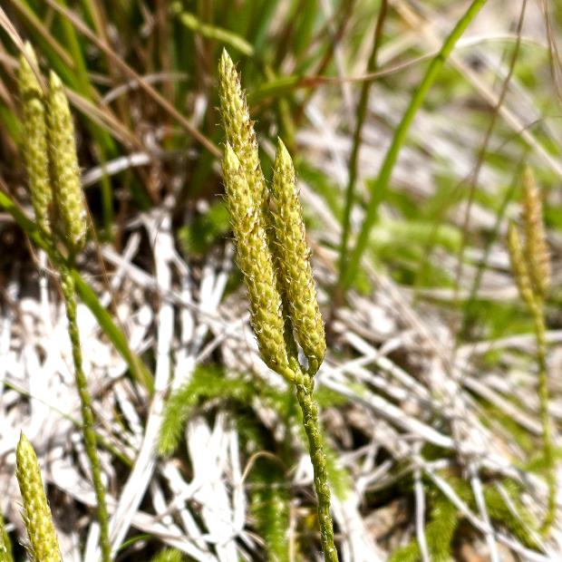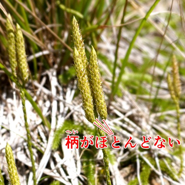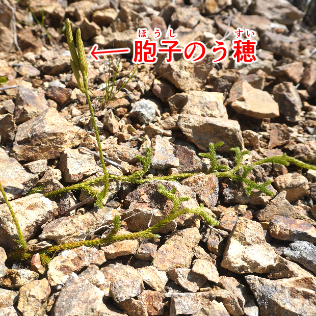 標高のある山地に多いシダ植物ですが、 低地でも見られることがあります。 ヒカゲノカズラの変種(へんしゅ : 亜種ほどではないけど同種とするには違いがあるもの)とされていて、 胞子のう穂の下に柄がほとんどないことが主な違いです。